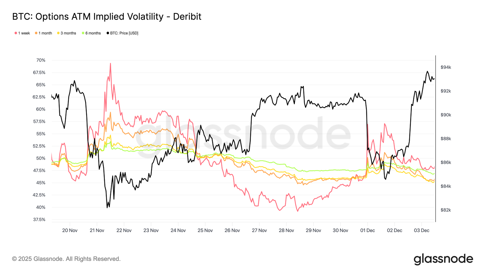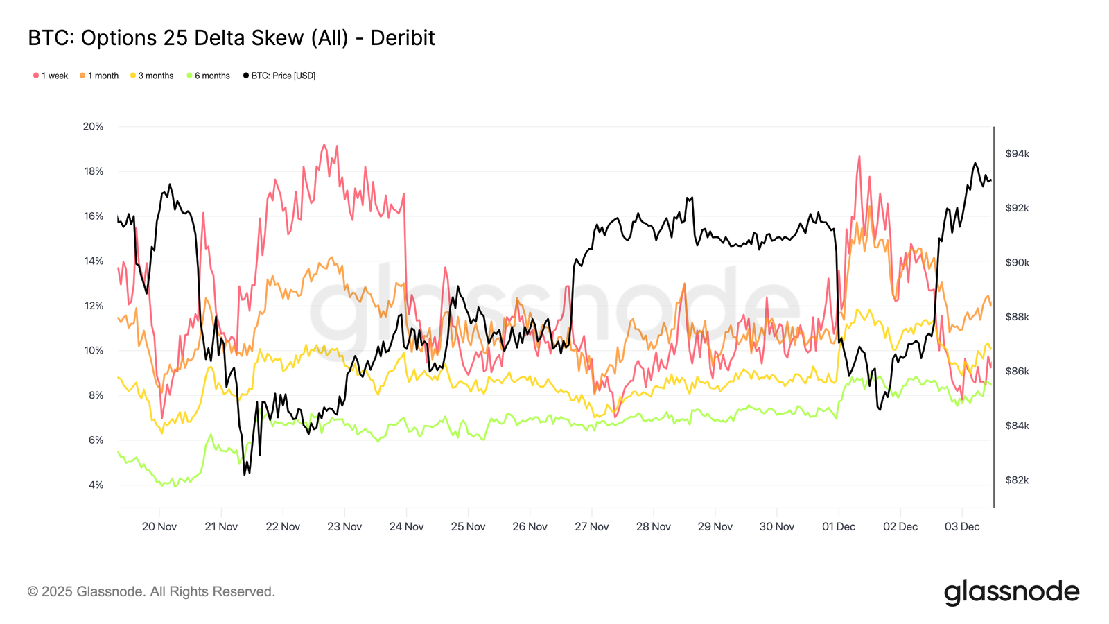 La volatilité implicite s'est réinitialisée à la baisse après les niveaux élevés enregistrés la semaine dernière. Le prix a eu du mal à dépasser la résistance des 92 000 points, et l'absence de suivi de la reprise a encouragé les vendeurs de volatilité à revenir, poussant la volatilité implicite à la baisse sur toutes les échéances.