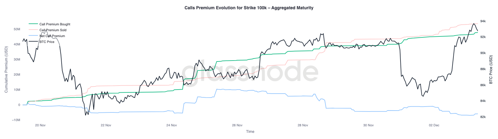 En se concentrant sur la prime d'option d'achat au prix d'exercice de 100 000 $, on comprend mieux comment les traders abordent ce niveau psychologique clé. Sur la partie droite du graphique, la prime d'option d'achat vendue reste supérieure à la prime d'option d'achat achetée, et l'écart entre les deux s'est creusé lors du rebond des dernières 48 heures.