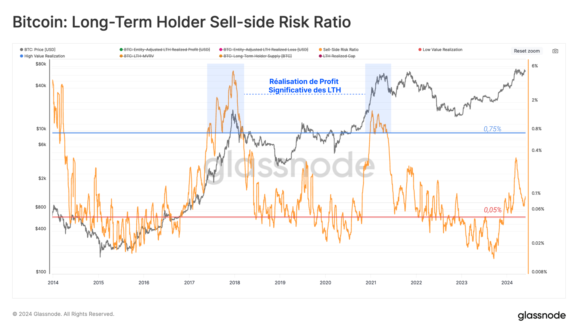 Pour la cohorte des détenteurs à long terme, le Sell-Side Risk Ratio a augmenté de manière significative à mesure que les profits ont été pris jusqu'à l'ATH de 73 000 $. Cependant, d'un point de vue historique, leur ratio reste à un niveau inférieur par rapport aux précédentes ruptures d'ATH.