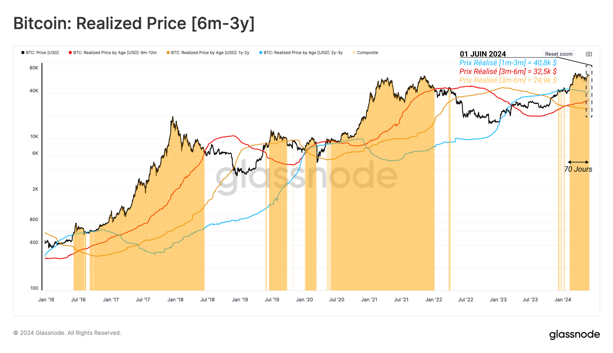 Nous pouvons étudier les prix d'achat moyens de différentes tranches d'âge, et un autre groupe intéressant est celui des détenteurs sur un cycle (BTC âgés de 6 mois à 3 ans).