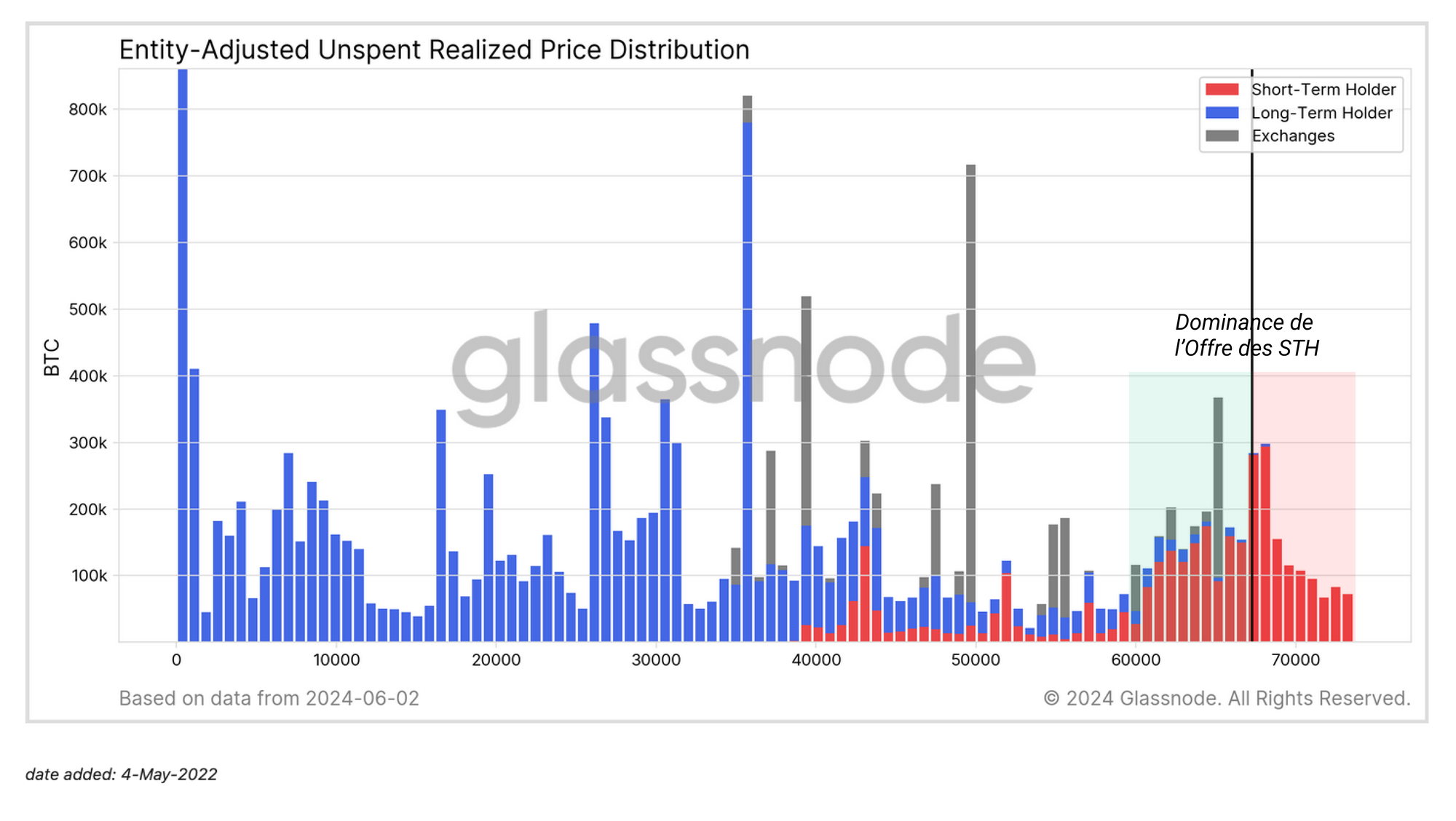 Inversement, pendant la phase euphorique du marché haussier, la contribution des LTH à l'offre détenue en perte tend vers zéro. Parallèlement, les STH supportent la grande majorité des pertes du marché, car la nouvelle demande achète des BTC à proximité des sommets locaux et cycliques.
