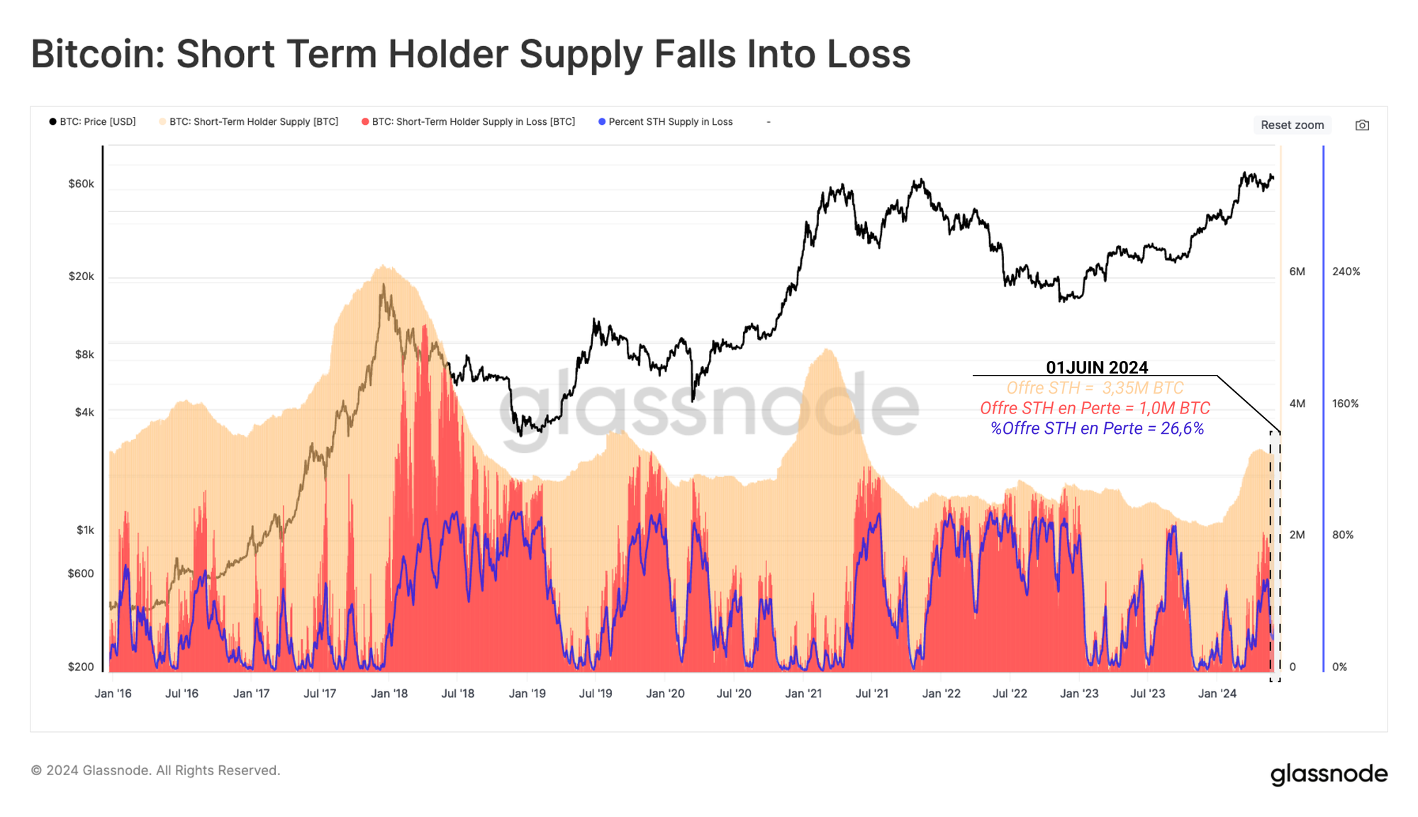 Le graphique ci-dessous est un outil décrivant la proportion de l'offre des détenteurs à court terme détenue à perte. Cet outil peut être utilisé pour savoir quand cette cohorte présente une sensibilité accrue à la volatilité, en particulier lorsqu'un volume important de l'offre tombe en perte sur une courte période de temps.