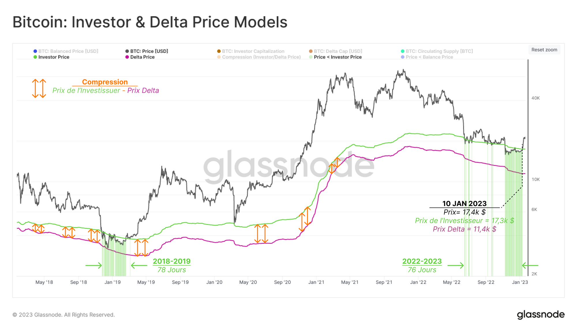 En plus de la composante de durée de la phase de formation du plancher, nous pouvons mesurer la compression de la fourchette de prix Investisseur-Delta comme indicateur de l'intensité de la sous-évaluation du marché.