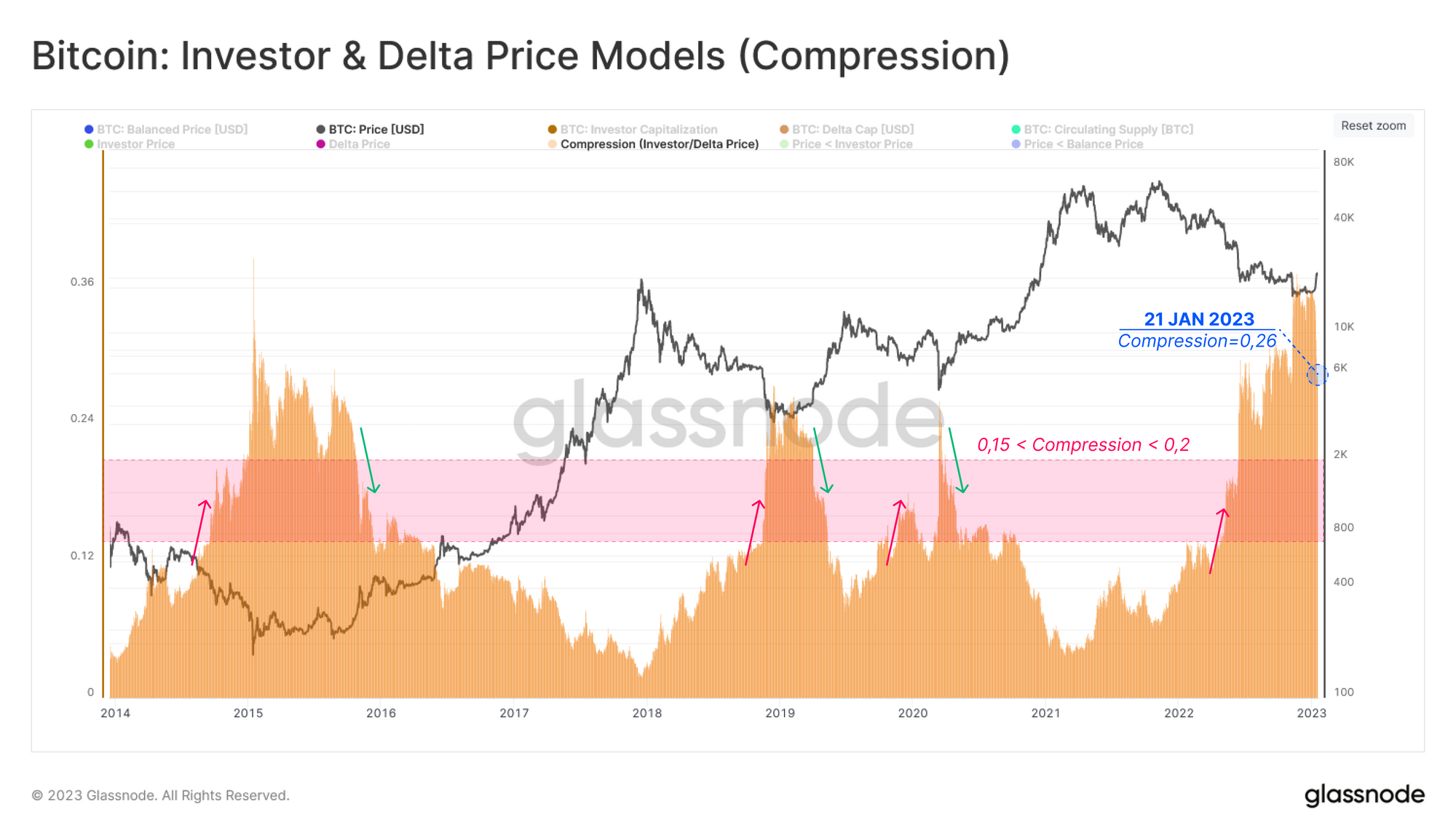 L'évaluation de la tendance historique de ce concept de compression Investisseur-Delta indique une zone seuil (0,15-0,2 🟥) qui peut être utilisée pour rechercher une confirmation de début ↗️ et de fin ↘️ de la phase de formation de plancher.