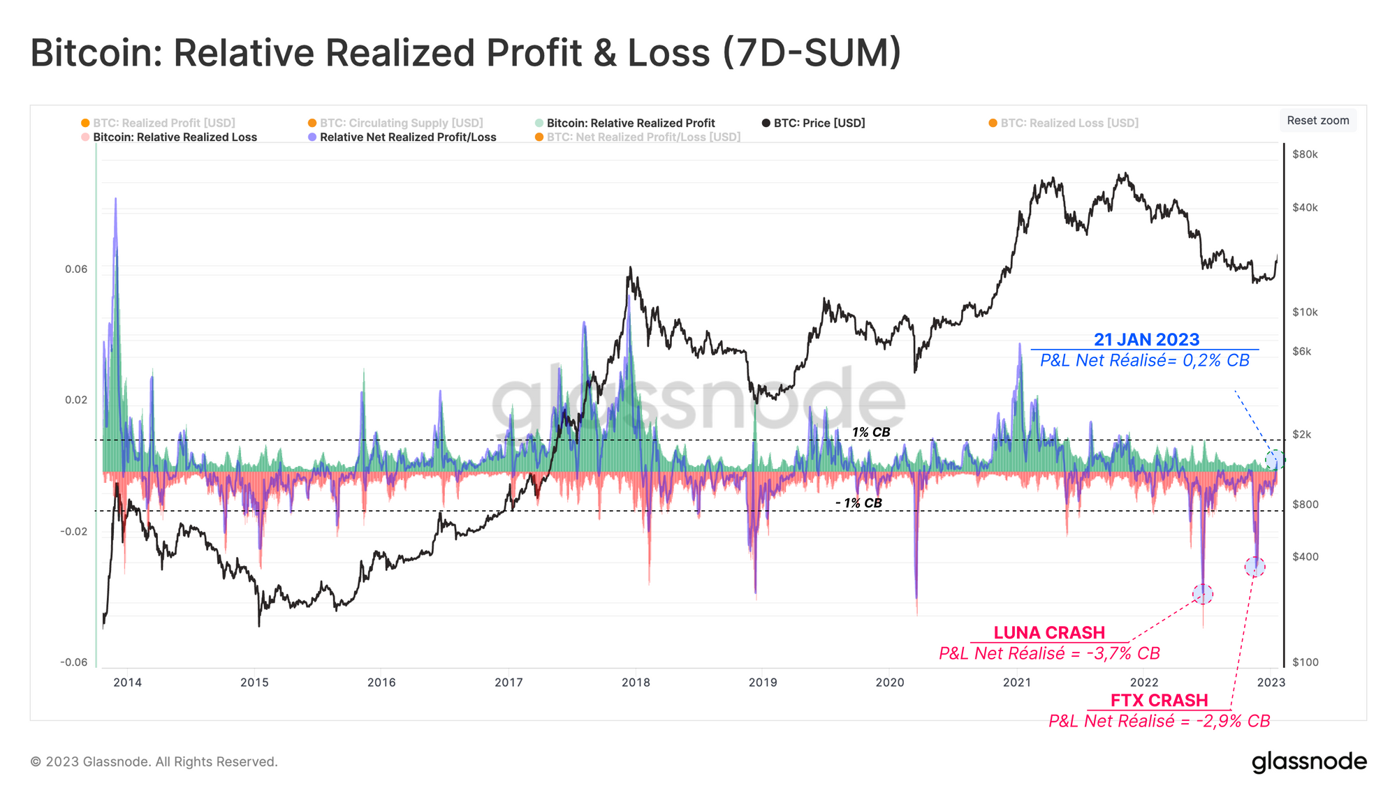 La métrique des profits et pertes réalisés mesure la différence entre la valeur des pièces au moment de l'achat et au moment de la vente. Le graphique ci-dessous affiche le volume agrégé hebdomadaire des profits et pertes réalisés aux côtés des profits et pertes nets réalisés. Pour comparer l'ampleur d'un cycle à l'autre, chaque trace est normalisée par la capitalisation boursière.