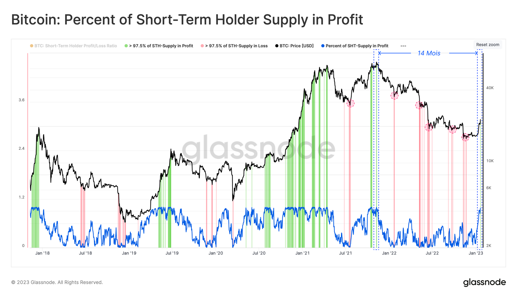Nous pouvons évaluer ce comportement via le pourcentage d'offre en profit des détenteurs à court terme 🔵.