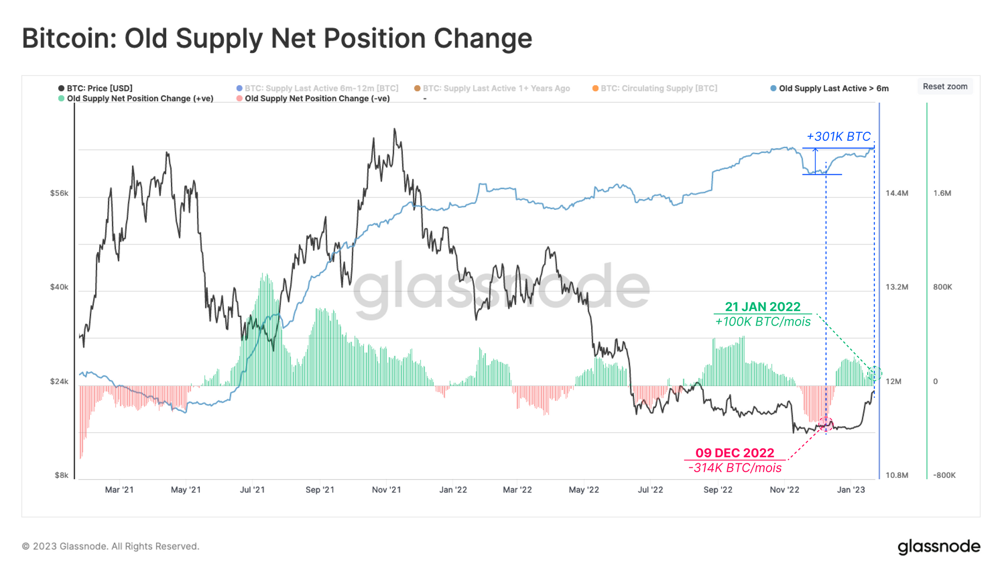 En d'autres termes, l'offre détenue par les HODLers est passée d'une contraction de -314k BTC/mois suite à l'effondrement de FTX à une expansion de +100k BTC/mois.