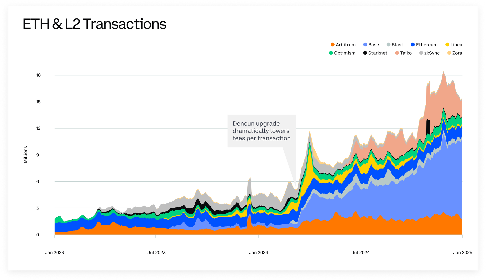 These trends increased in momentum with the March 2024 Dencun upgrade, which dramatically lowered Layer-2 transaction fees. The cost reductions made Layer-2s an even more attractive settlement layer, unlocking new use cases across DeFi, payments, and gaming.