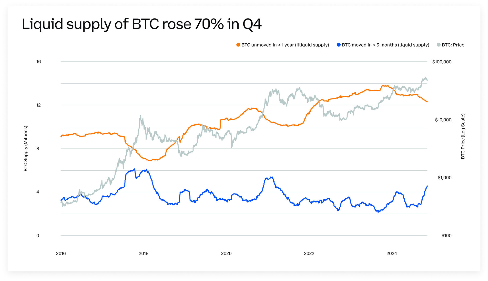 As Bitcoin rallied to new highs in Q4, long-term holders began distributing coins into market strength. Active supply - BTC that moved within the last three months - rose nearly 70%, bringing over 1.8M BTC into active circulation.