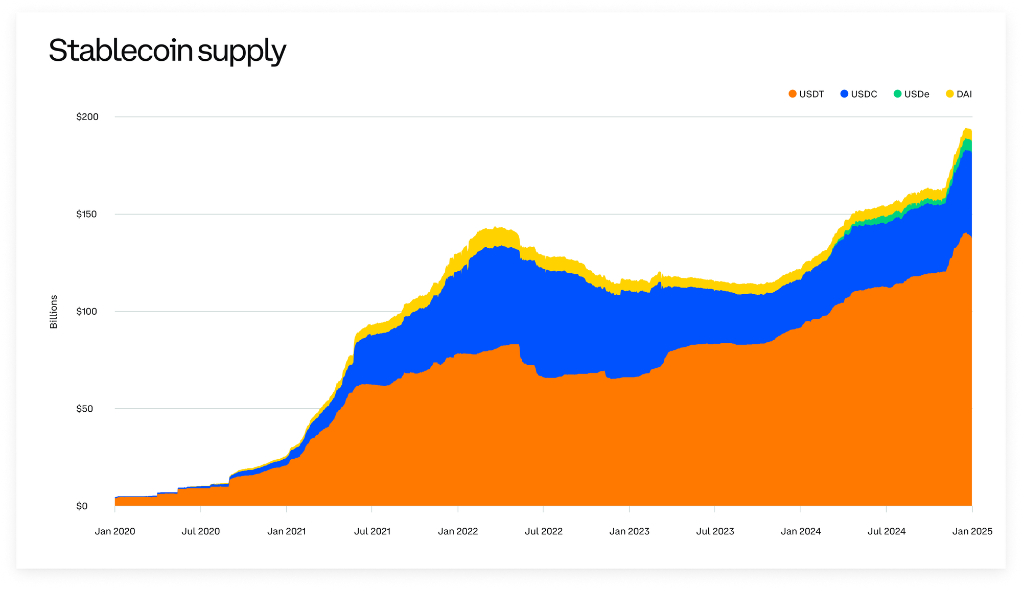 In Q4, total stablecoin supply grew by 18%, pushing the combined market value of the largest stablecoins toward $200B. This growth reflects: