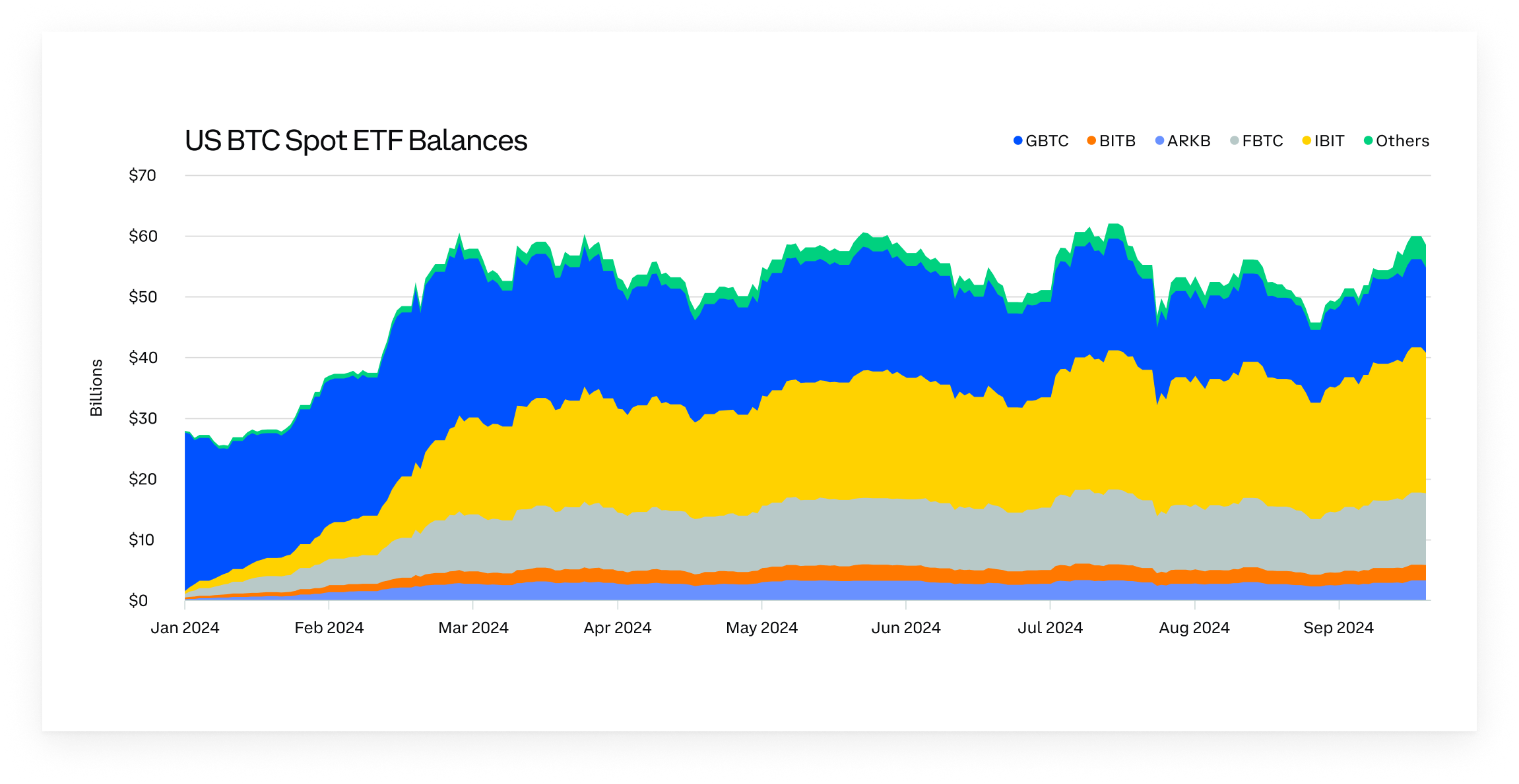 One of the biggest stories in the market is the rise of Bitcoin spot ETFs. In Q3, US-based Bitcoin ETFs saw over $5 billion in net inflows, underscoring the strong demand for direct exposure to Bitcoin among institutional investors. These ETFs have become key drivers of liquidity and accessibility, making it easier for a broader range of market participants to gain exposure to Bitcoin without the complexities of direct ownership.