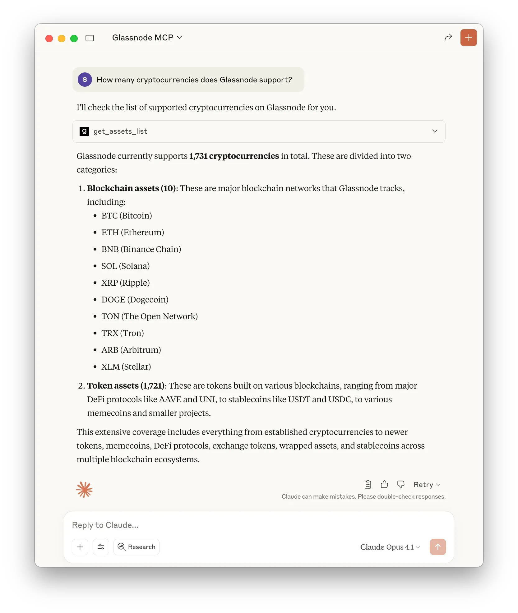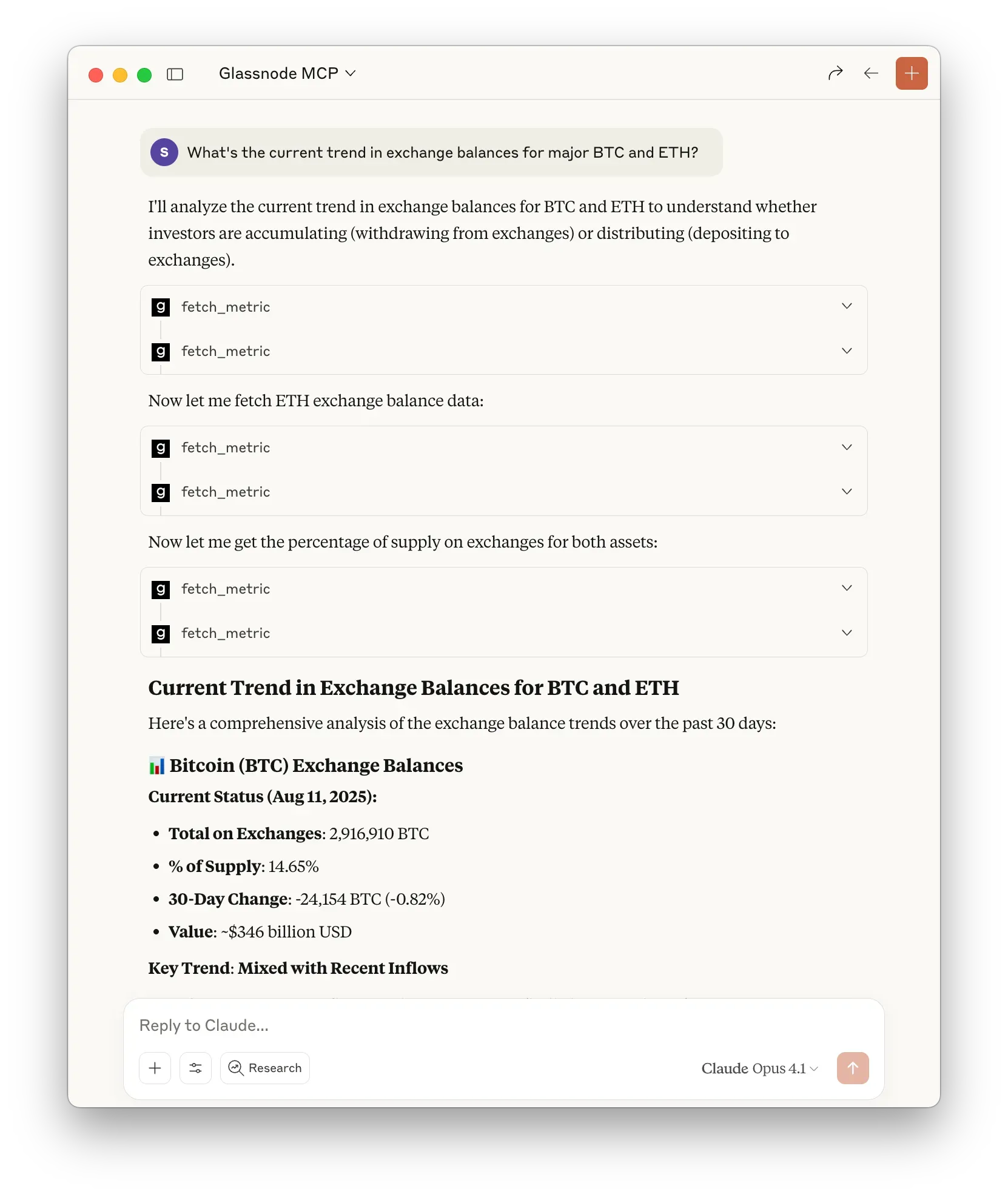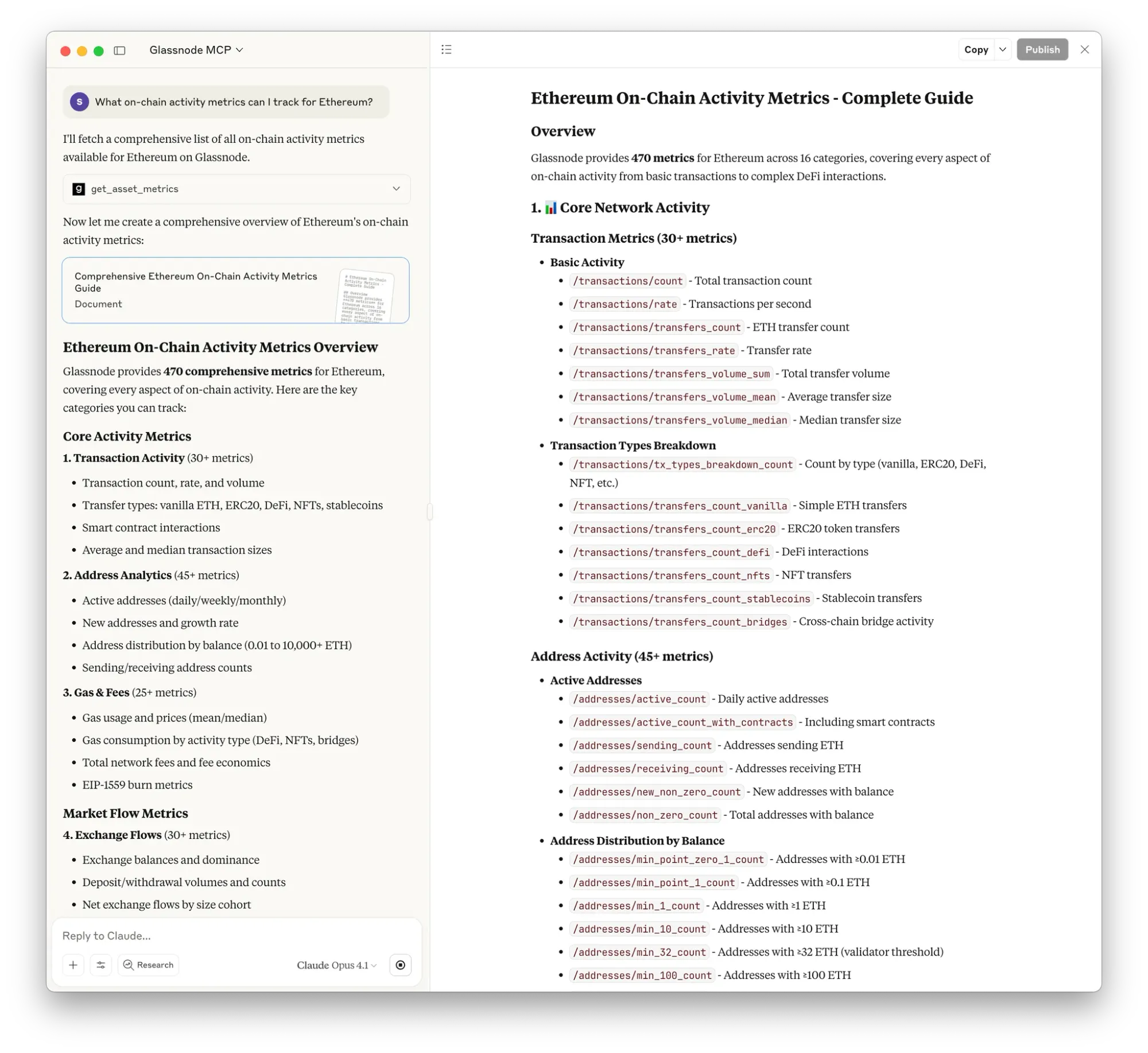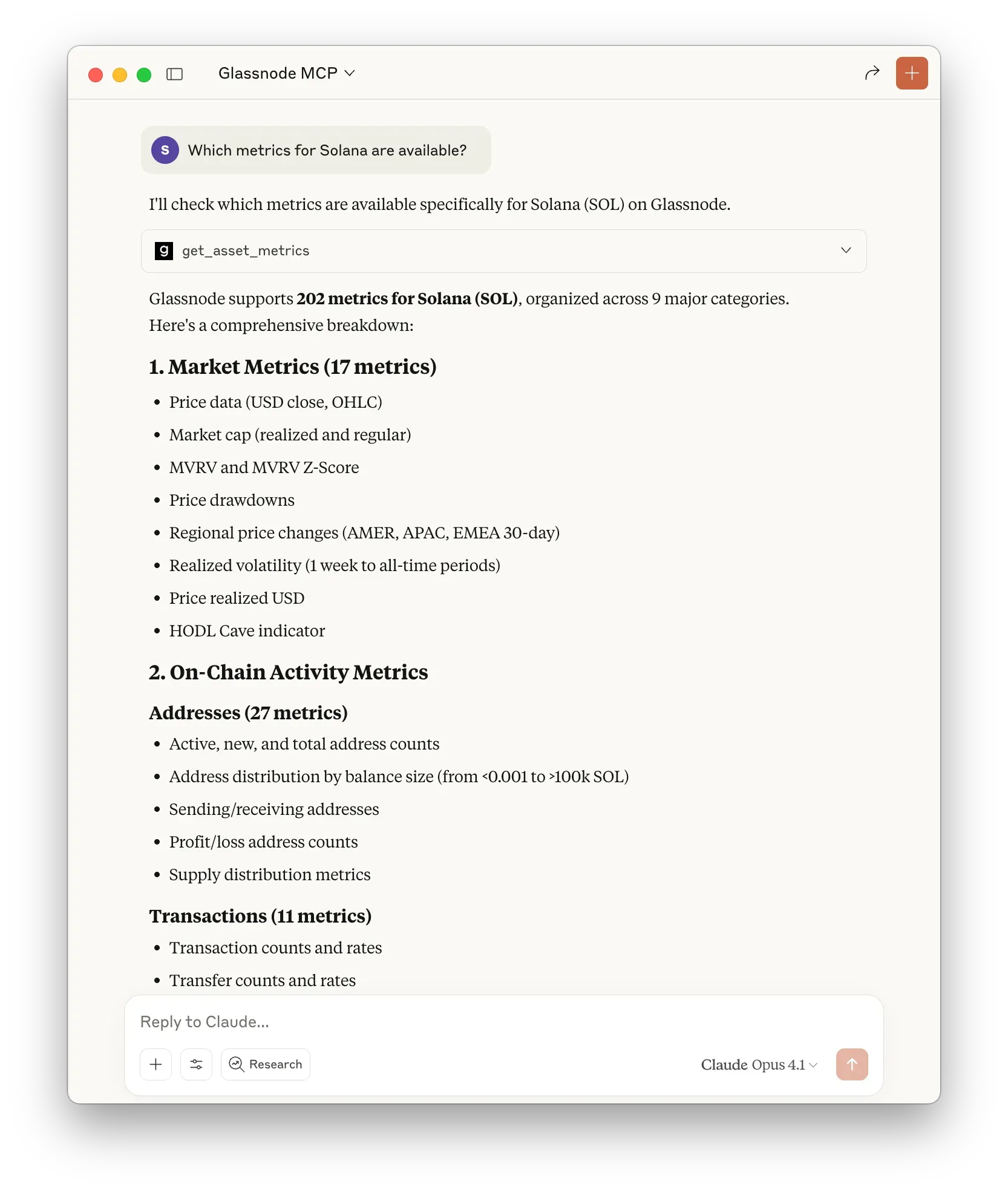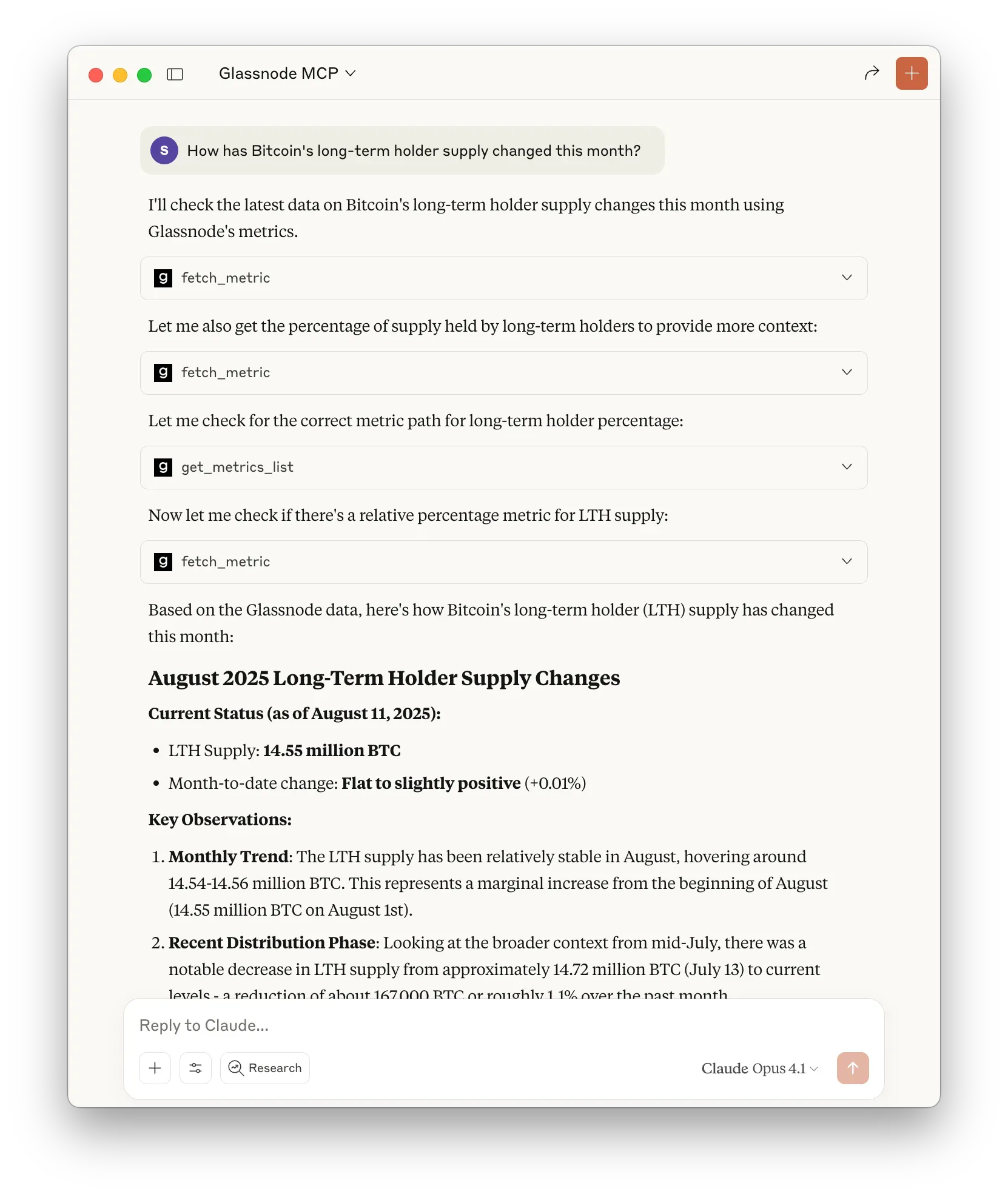 While this guide focuses on chat-based interactions, the MCP server is equally powerful for programmatic and agentic workflows. Developers can integrate these same tools into automated systems, building sophisticated analytics pipelines that leverage Glassnode's comprehensive data coverage across 900+ metrics and 1,600+ assets.