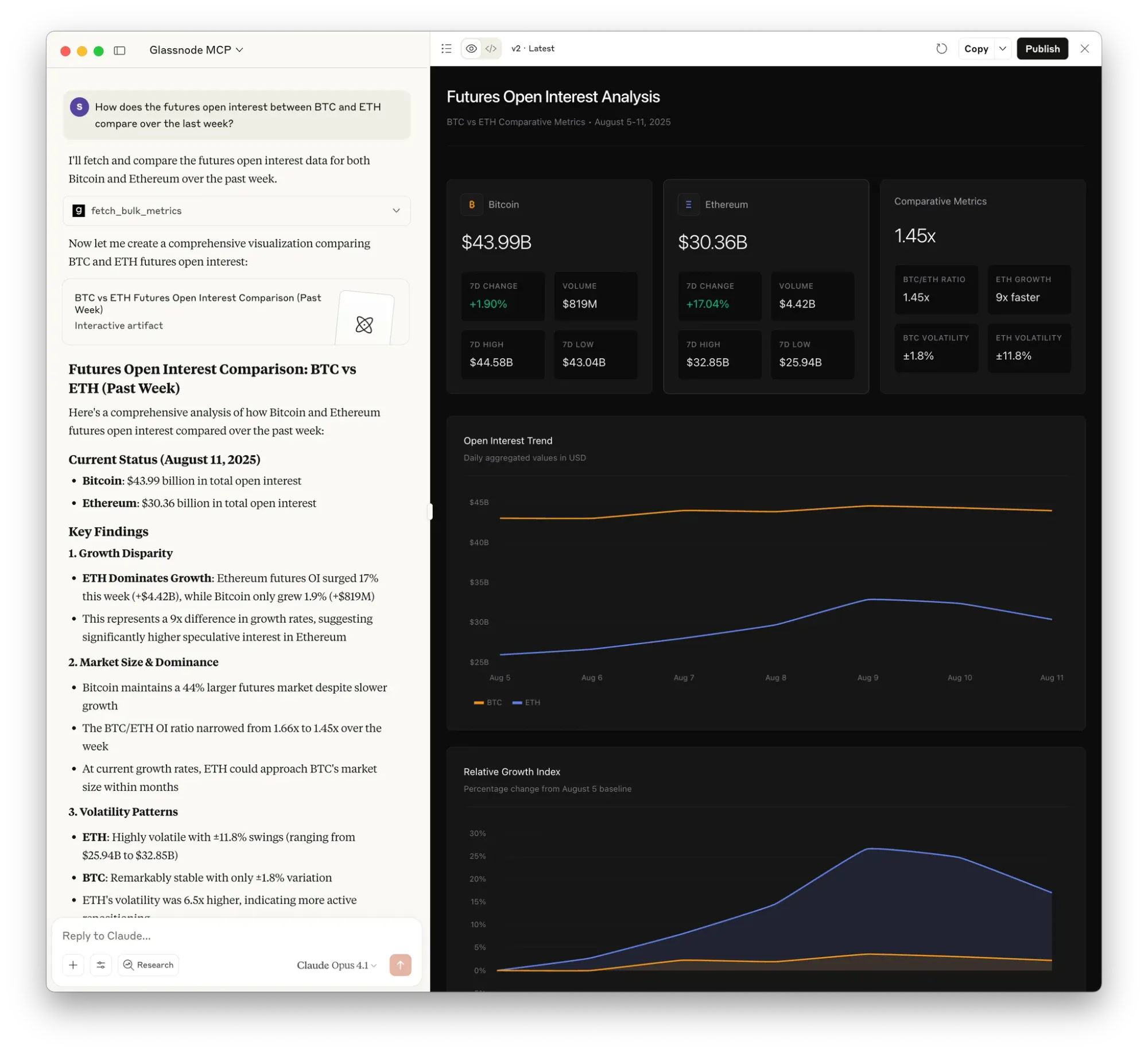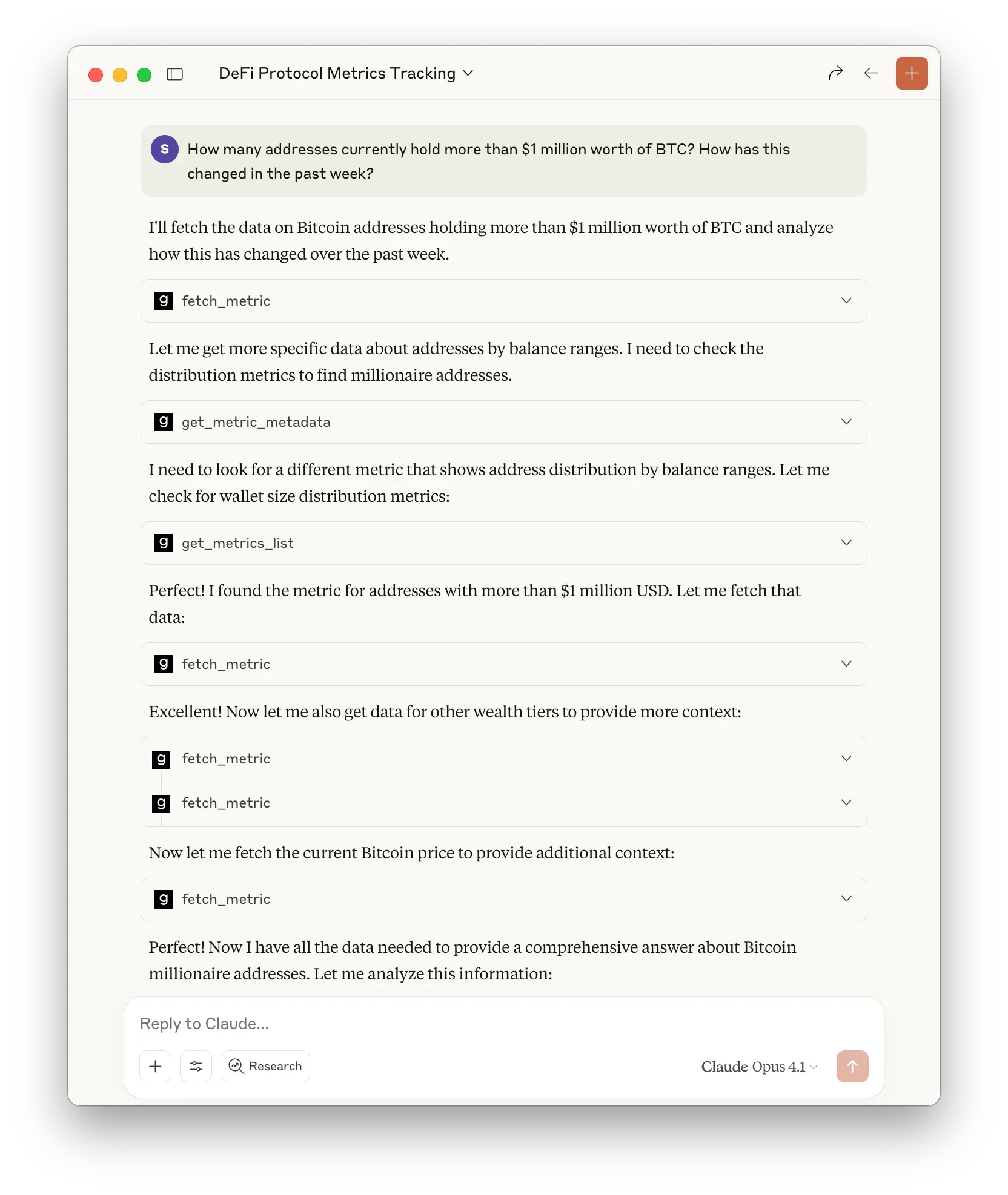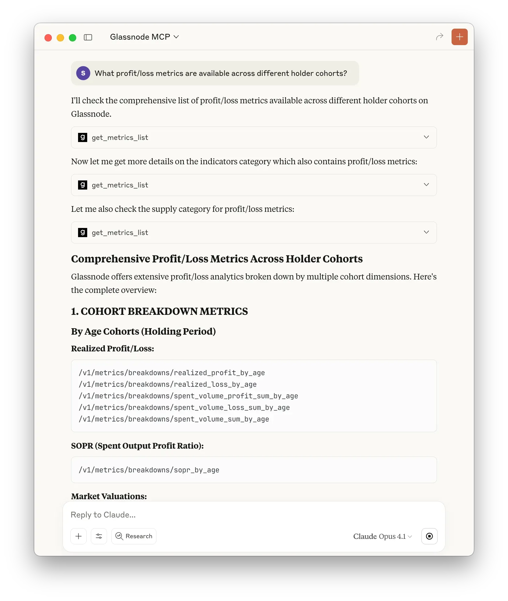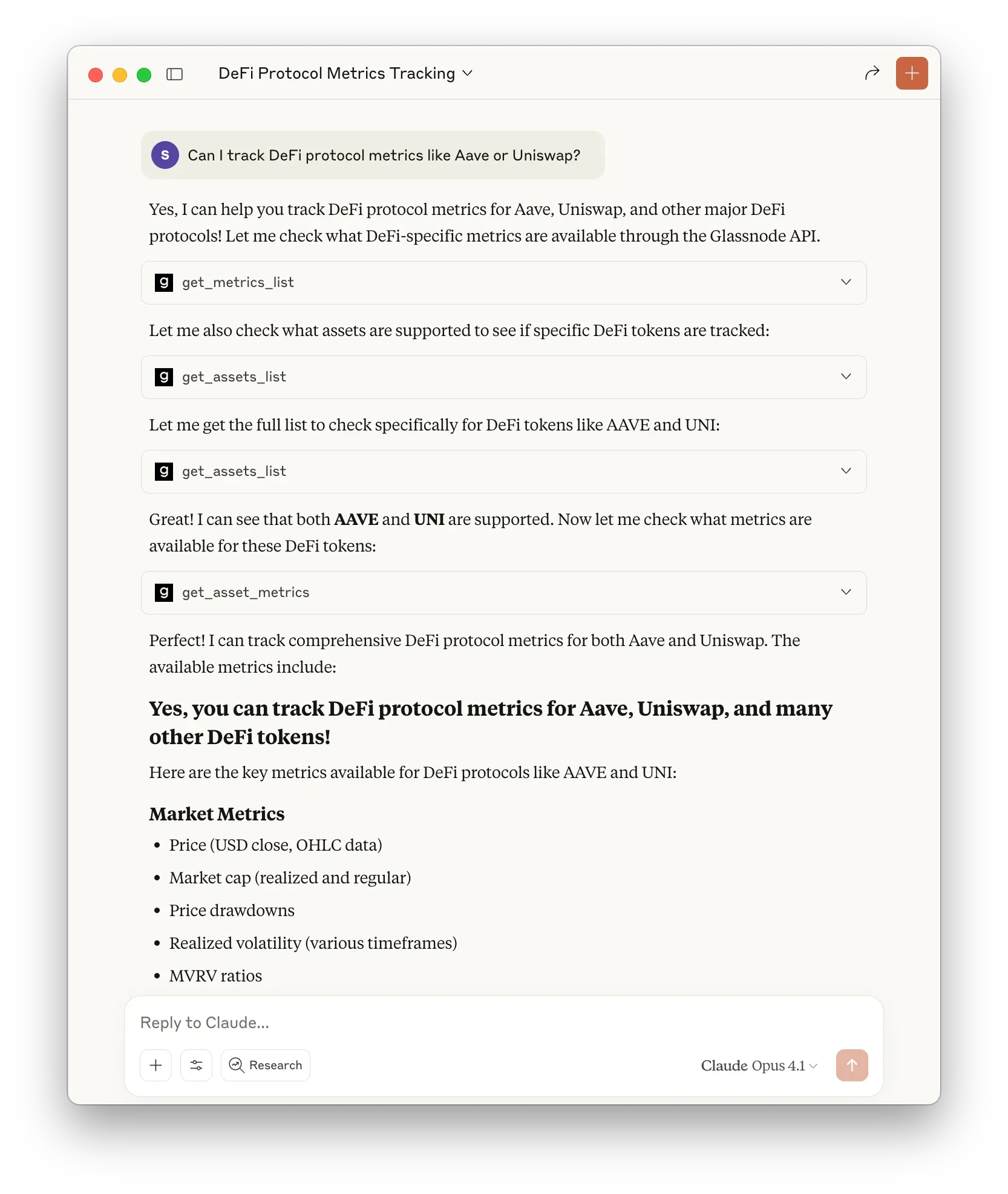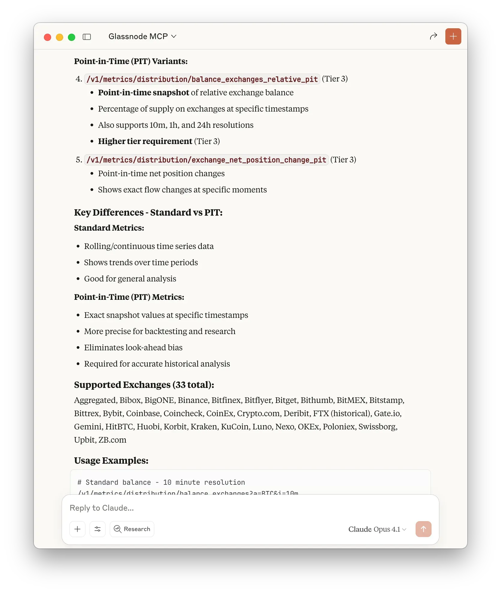 While this guide focuses on chat-based interactions, the MCP server is equally powerful for programmatic and agentic workflows. Developers can integrate these same tools into automated systems, building sophisticated analytics pipelines that leverage Glassnode's comprehensive data coverage across 900+ metrics and 1,600+ assets.