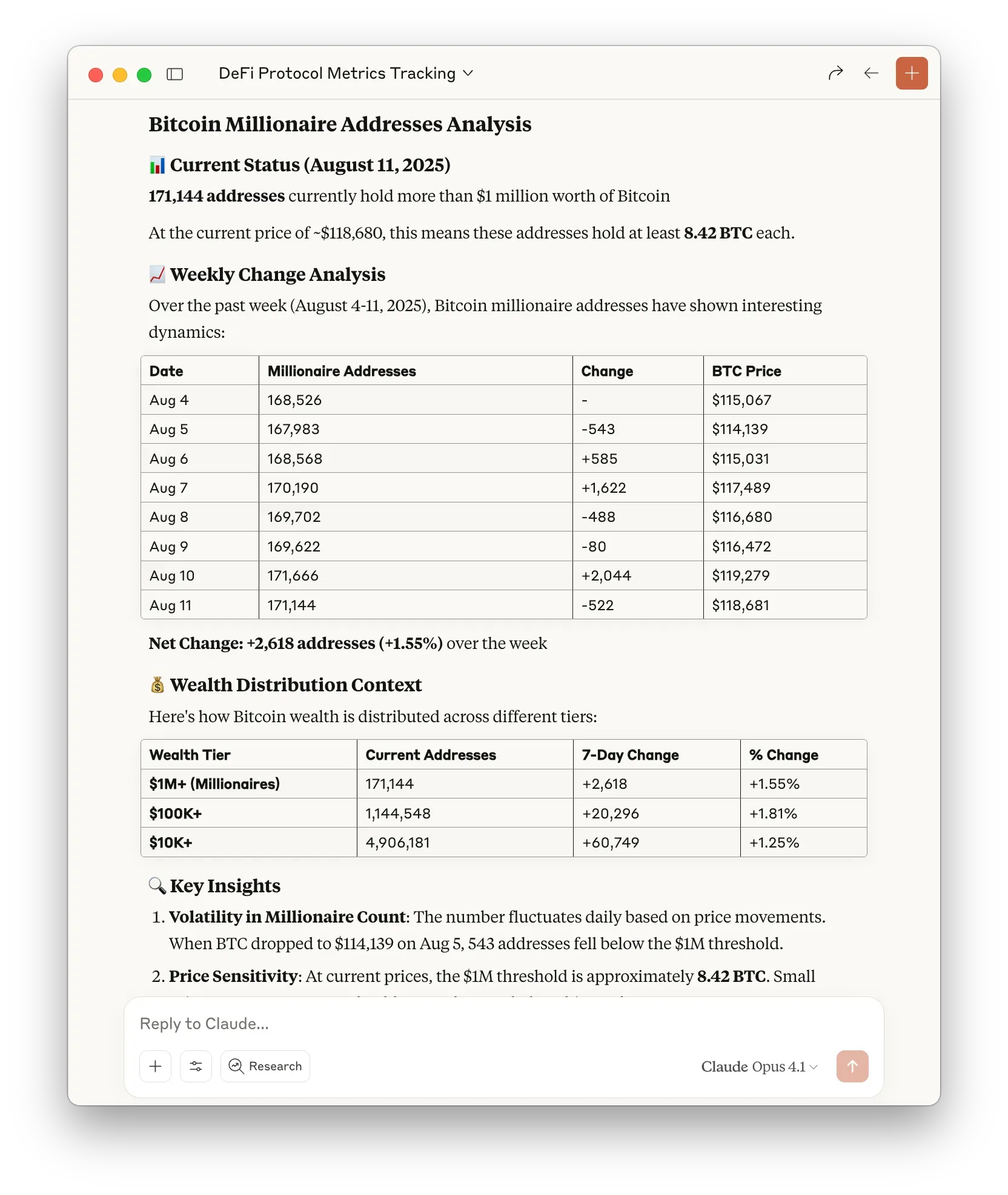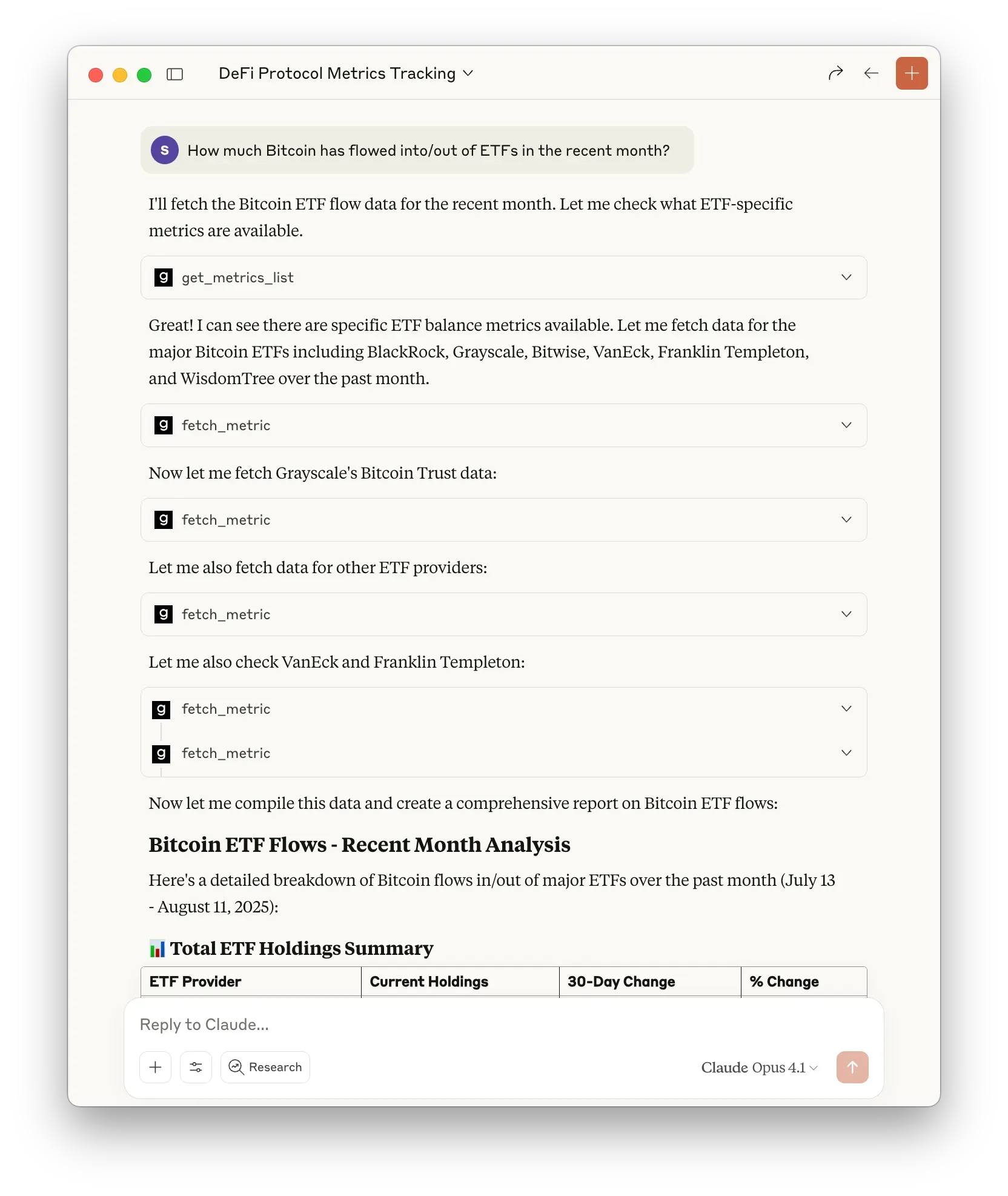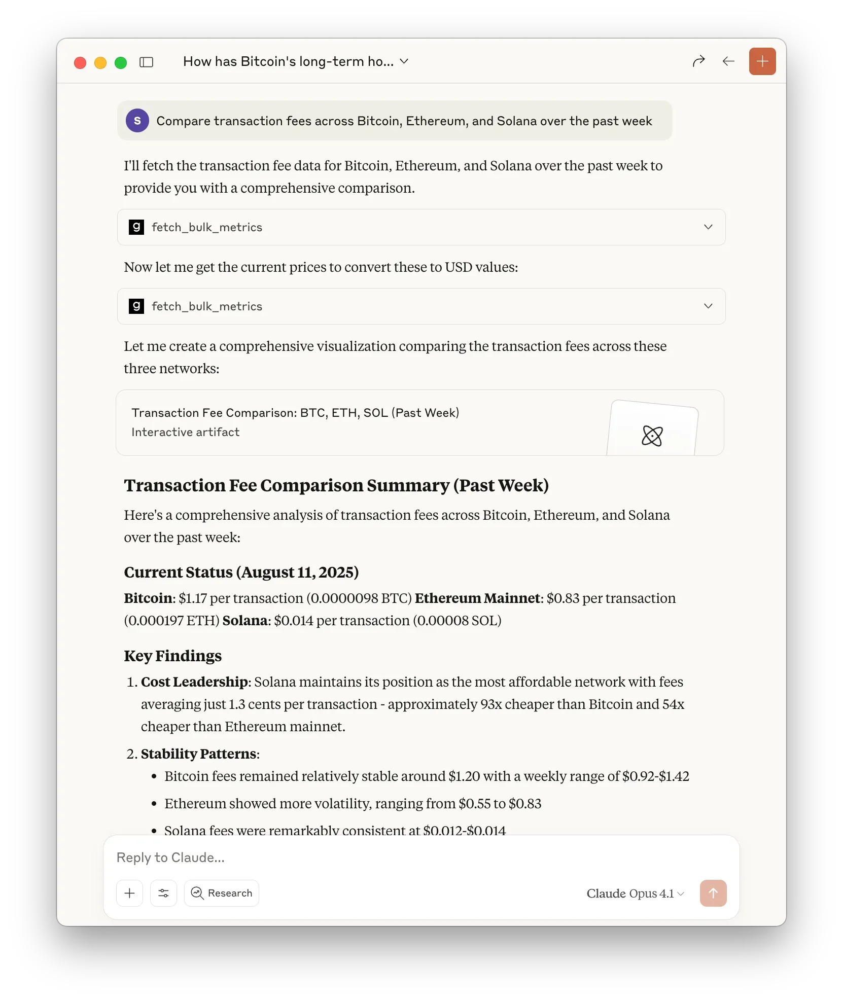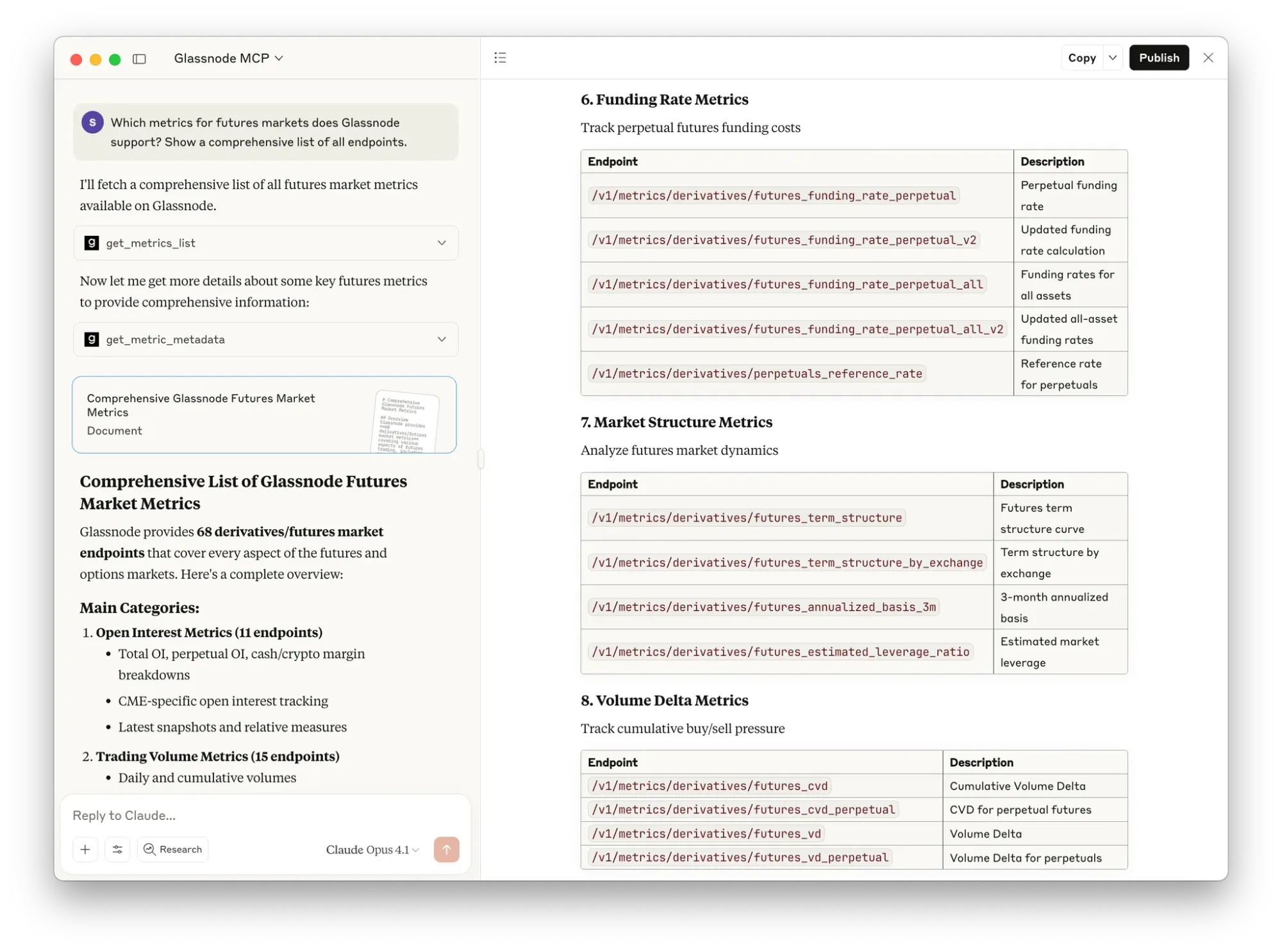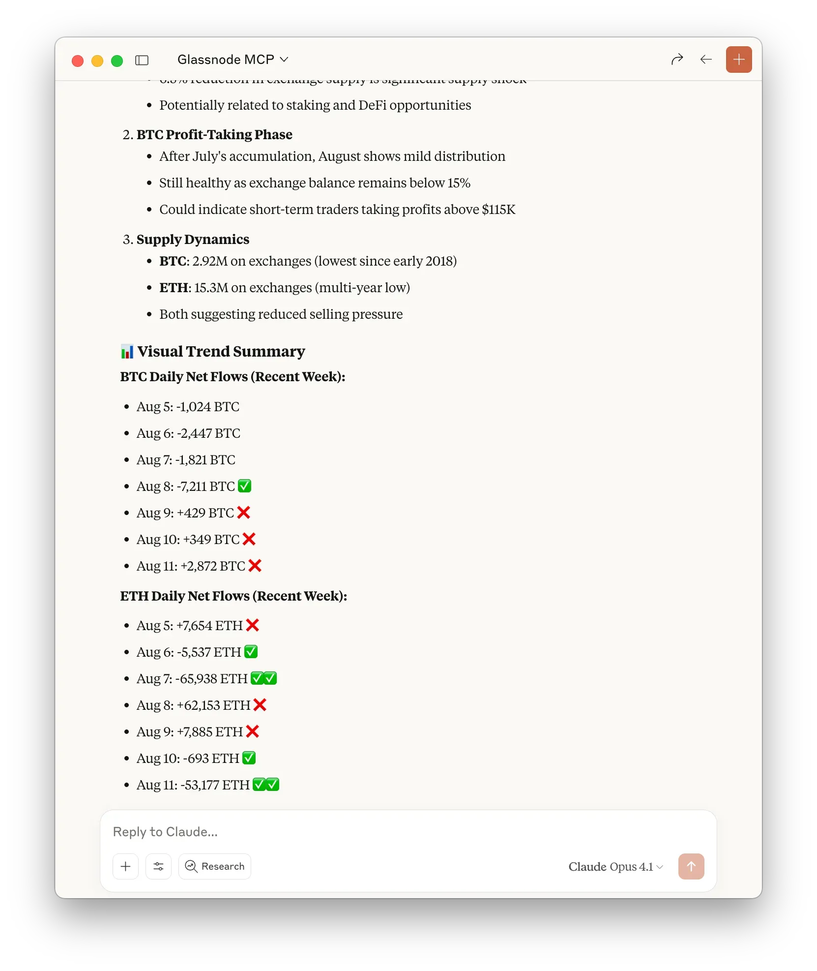 While this guide focuses on chat-based interactions, the MCP server is equally powerful for programmatic and agentic workflows. Developers can integrate these same tools into automated systems, building sophisticated analytics pipelines that leverage Glassnode's comprehensive data coverage across 900+ metrics and 1,600+ assets.
