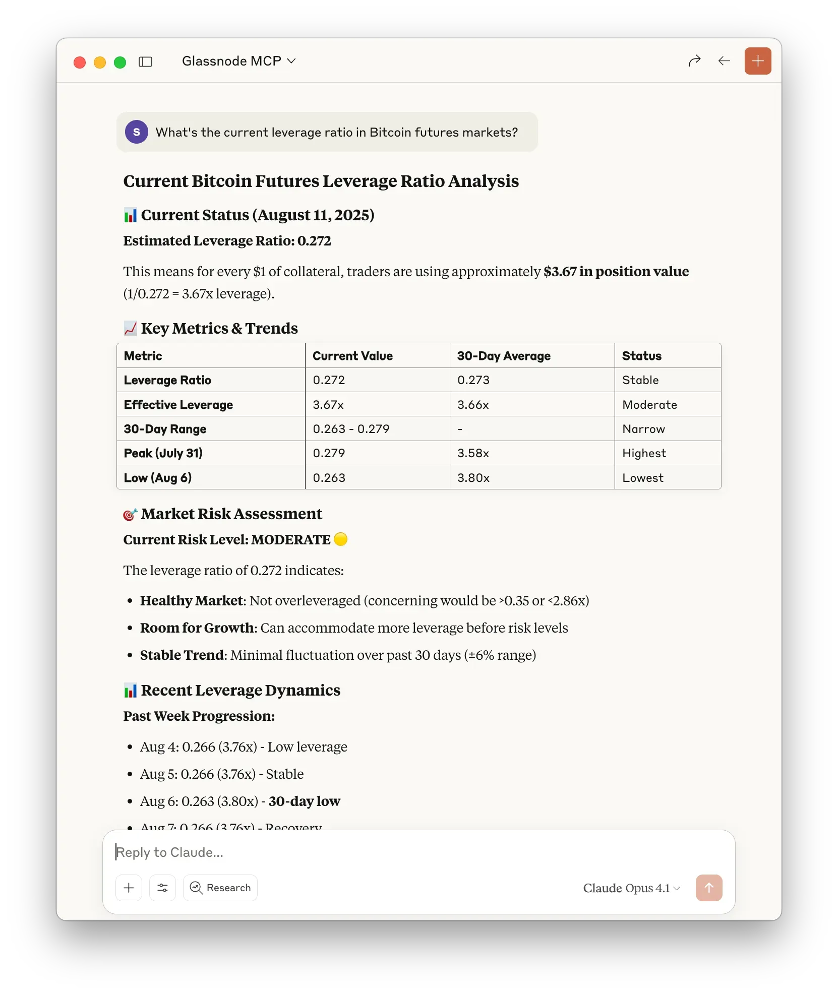 The Glassnode MCP Server is currently in beta with temporary free access for all users. View the full documentation with setup instructions on how to add to Claude Desktop.