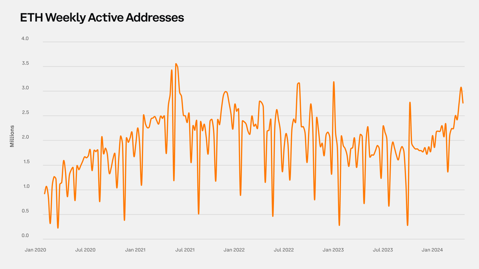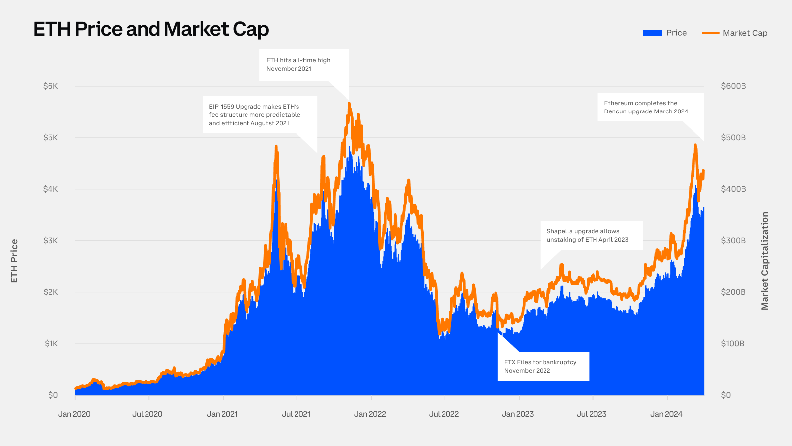 In this spotlight article, the third in our Glassnode Spotlights series on the Coinbase x Glassnode Q2 report, we are turning our attention to the Ethereum landscape. The first quarter of 2024 has been critical for Ethereum, marked by major developments that are transforming how it operates. The Dencun upgrade enhanced Ethereum's scalability and lowered transaction costs. Meanwhile, Ethereum's price hit $4K, a level not seen in two years. This period also saw a notable increase in Ethereum staking. In this piece, we will examine these changes and discuss their wider effects on the Ethereum network.
