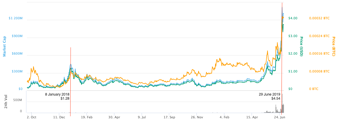These price levels are especially impressive when compared to LINK's performance during the January 2018 peak. The recent high of $4.54 on June 29 marked an all time high for LINK, more than 3.5 times its previous ATH of $1.28.