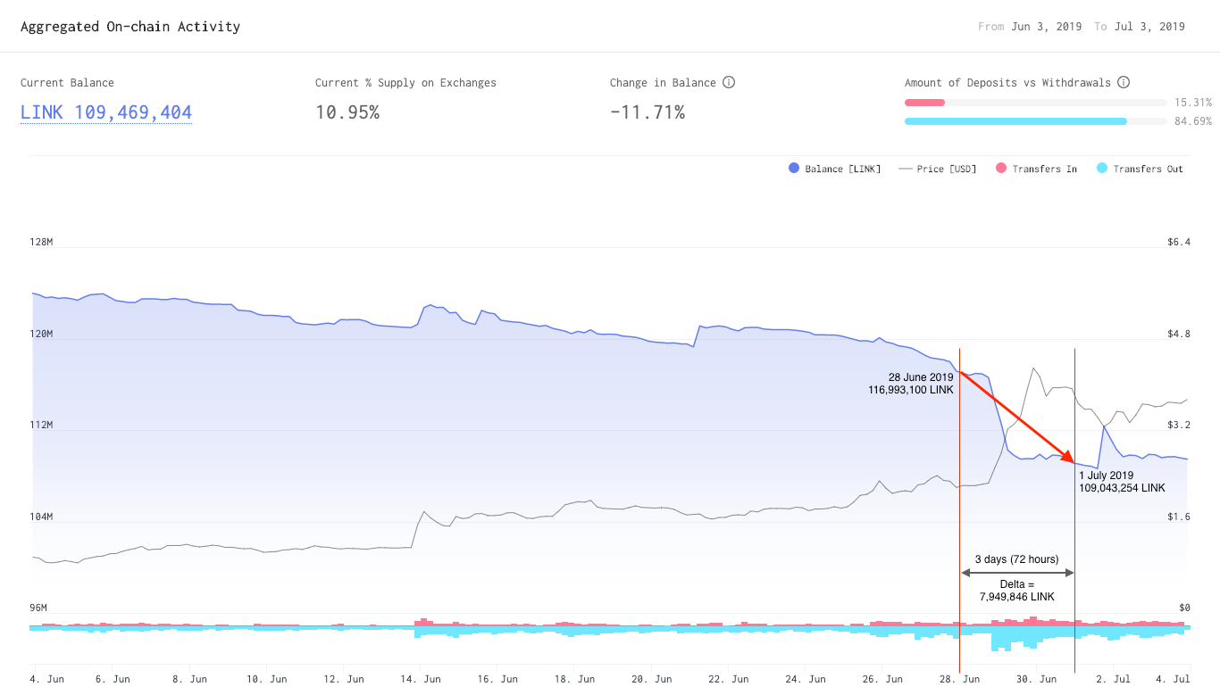 When apparent inter-exchange transfers (e.g. transfers from Binance to Coinbase) are excluded, this amounts to 115,753,322 LINK being transferred out of private non-exchange wallets; 14.6 times as much as the volume transferred between exchanges during the same time period.