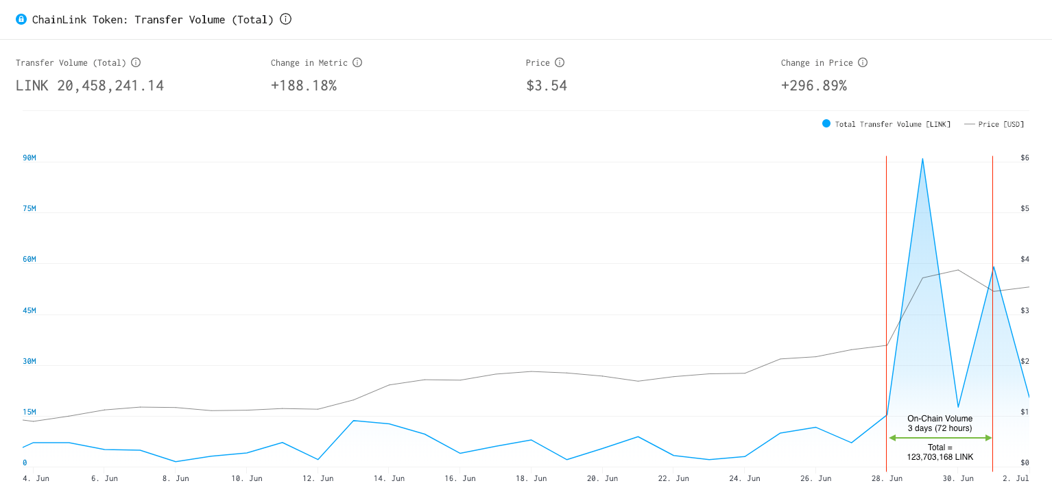 During the same 3 day time period outlined above, on-chain volumes totalled at 123,703,168 LINK.