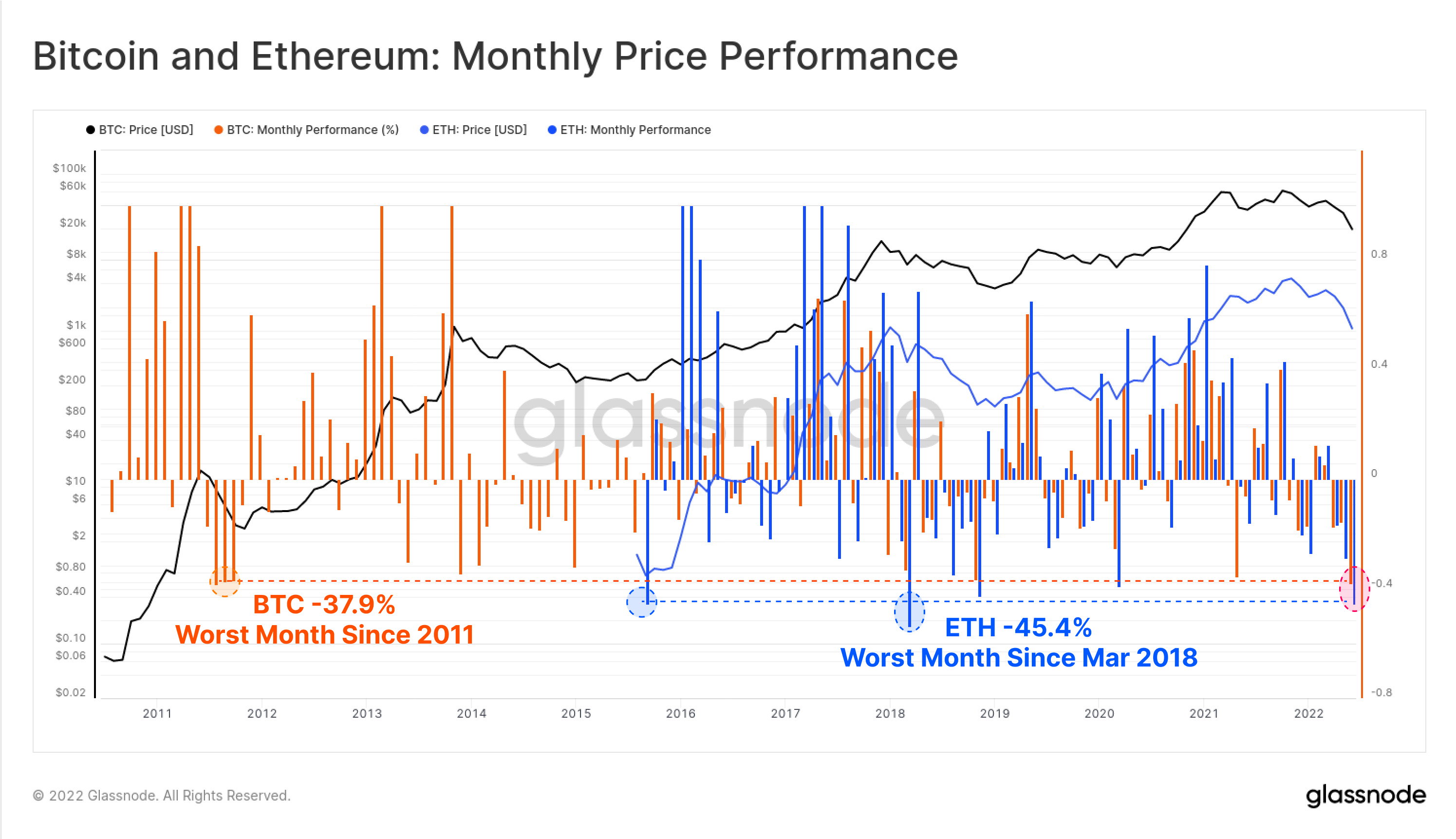 The year-to-date performance of 2022 has been remarkably challenging for investors, seeing BTC prices trade down 75% from the all-time-high, and ETH down over 80%. June in particular has been one of the worst months on record for both assets: