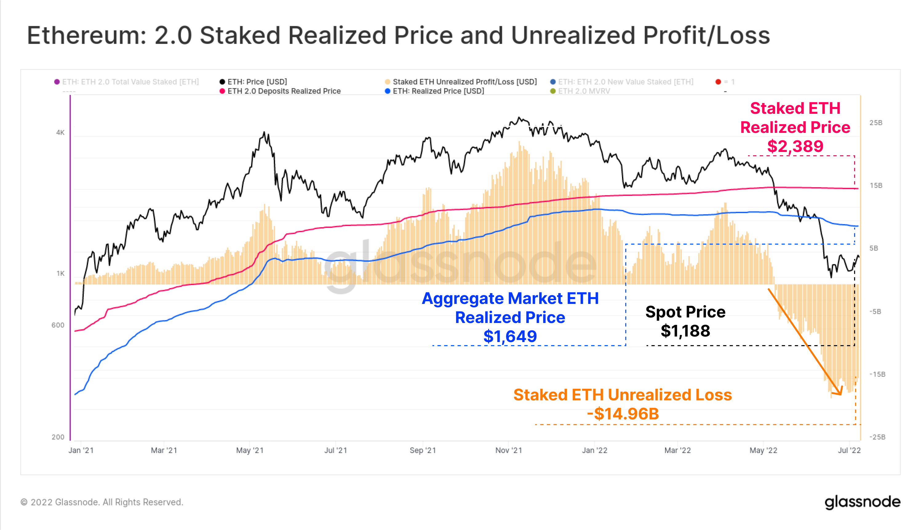 With over 13M ETH staked, this puts the the total unrealized loss held by ETH in the 2.0 deposit contract at $14.96 Billion.