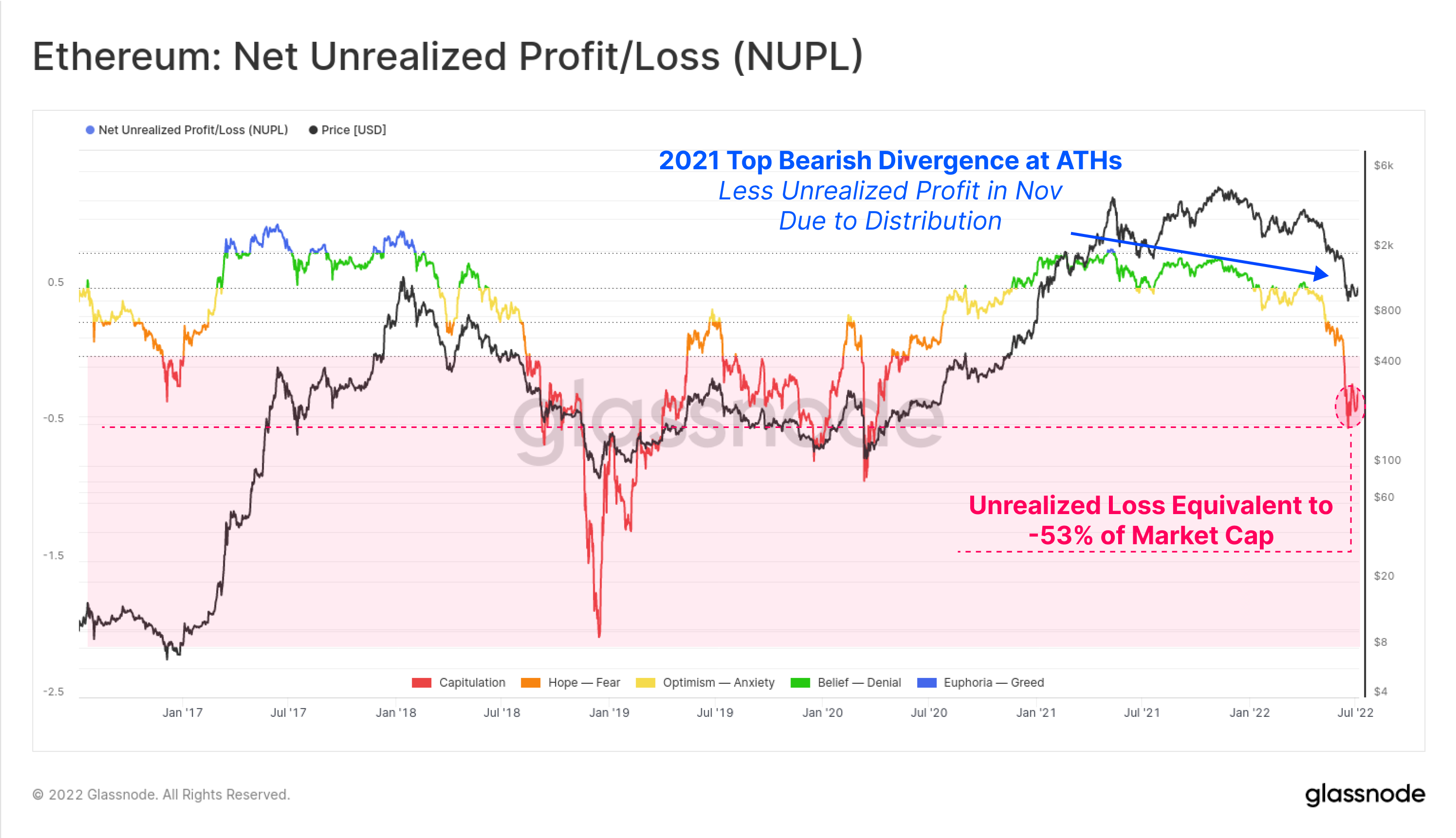 If we return to aggregate market profitability, we can see that the Net Unrealized Loss for ETH investors is severely worse than their Bitcoin counterparts. A similar bearish divergence can be seen between the 2021 market highs, and the current market is holding losses equivalent to 53% of the Market Cap.