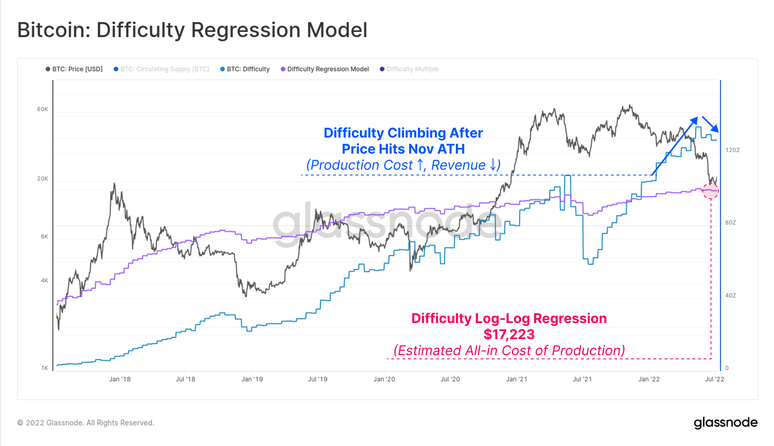 - The Difficulty Ribbon Compression (purple) signals that hashrate is indeed coming offline, causing protocol difficulty to fall in a statistically significant way. This is an explicit observation that ASIC rigs are being switched off due to income stress.
