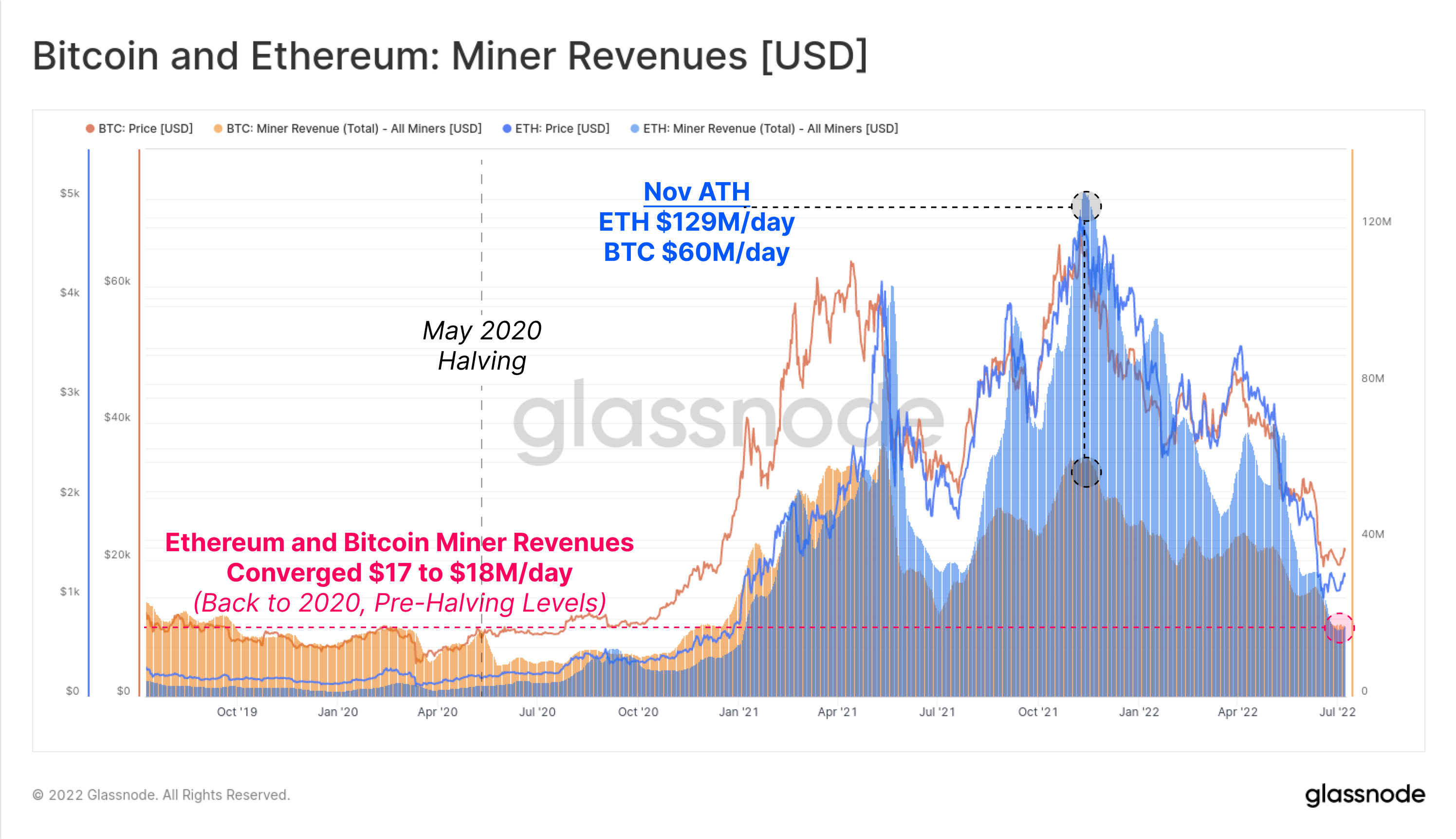We can see that the aggregate mining revenues for Bitcoin and Ethereum have dropped dramatically, with both converging at around $17M to $18M per day. Ethereum miners are now once again earning less than Bitcoin miners, despite ETH revenues reaching more than double BTC revenues at the Nov 2021 peak.