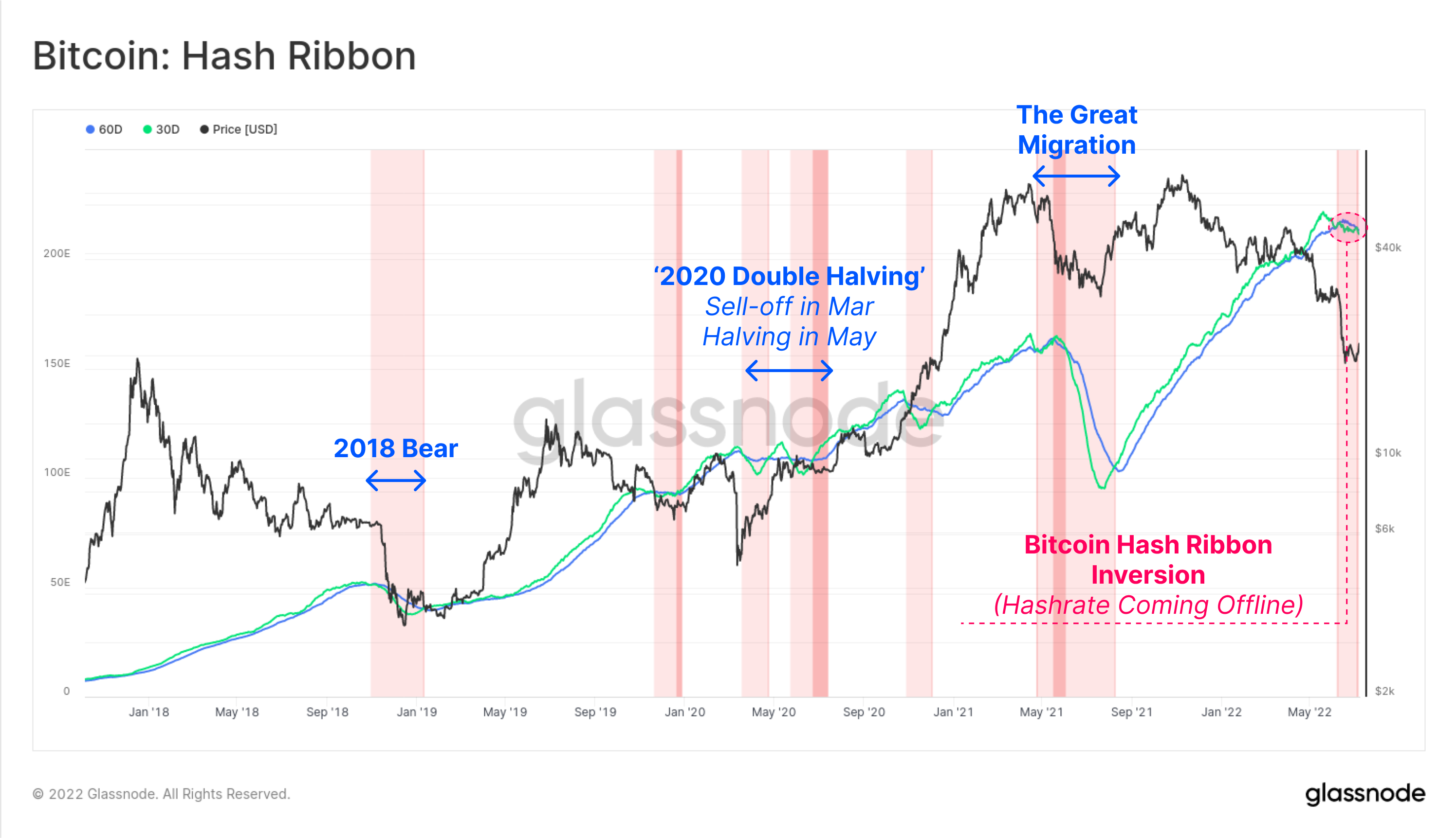 Similar events in the past can be seen at the 2018 bear market lows, and then again during the back-to-back 'halvings' in 2020 (first, prices halved in the March 2020 sell-off, and then the BTC subsidy halved at the Bitcoin halving event in May). The impact of the Great Migration is also visible between May and July 2021.
