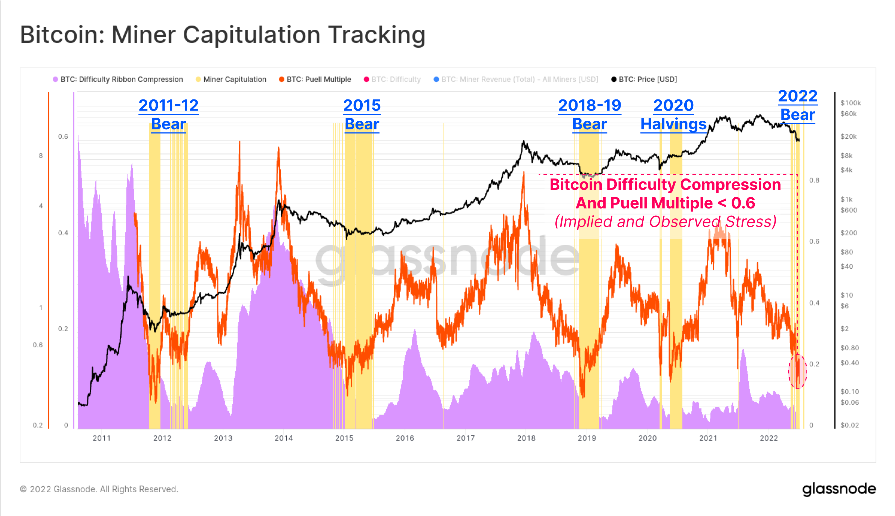 - Miner Capitulation Risk (yellow zones) highlight periods where both metrics are signalling meaningful lows, and generally correlate with extreme bear market lows, and an elevated risk of miner capitulation events.