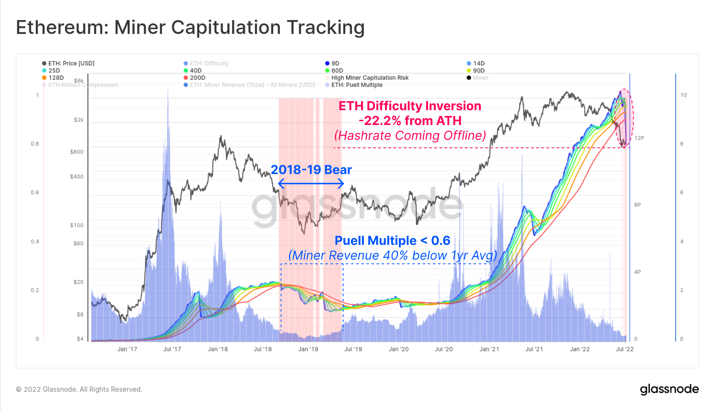Finally, we can see that Ethereum mining difficulty and hashrate are also experiencing a dramatic decline, dropping by 22.2% from the ATH. The Puell Multiple (blue) has fallen to just 0.3, signalling that aggregate miner revenues are just 30% of the yearly average.