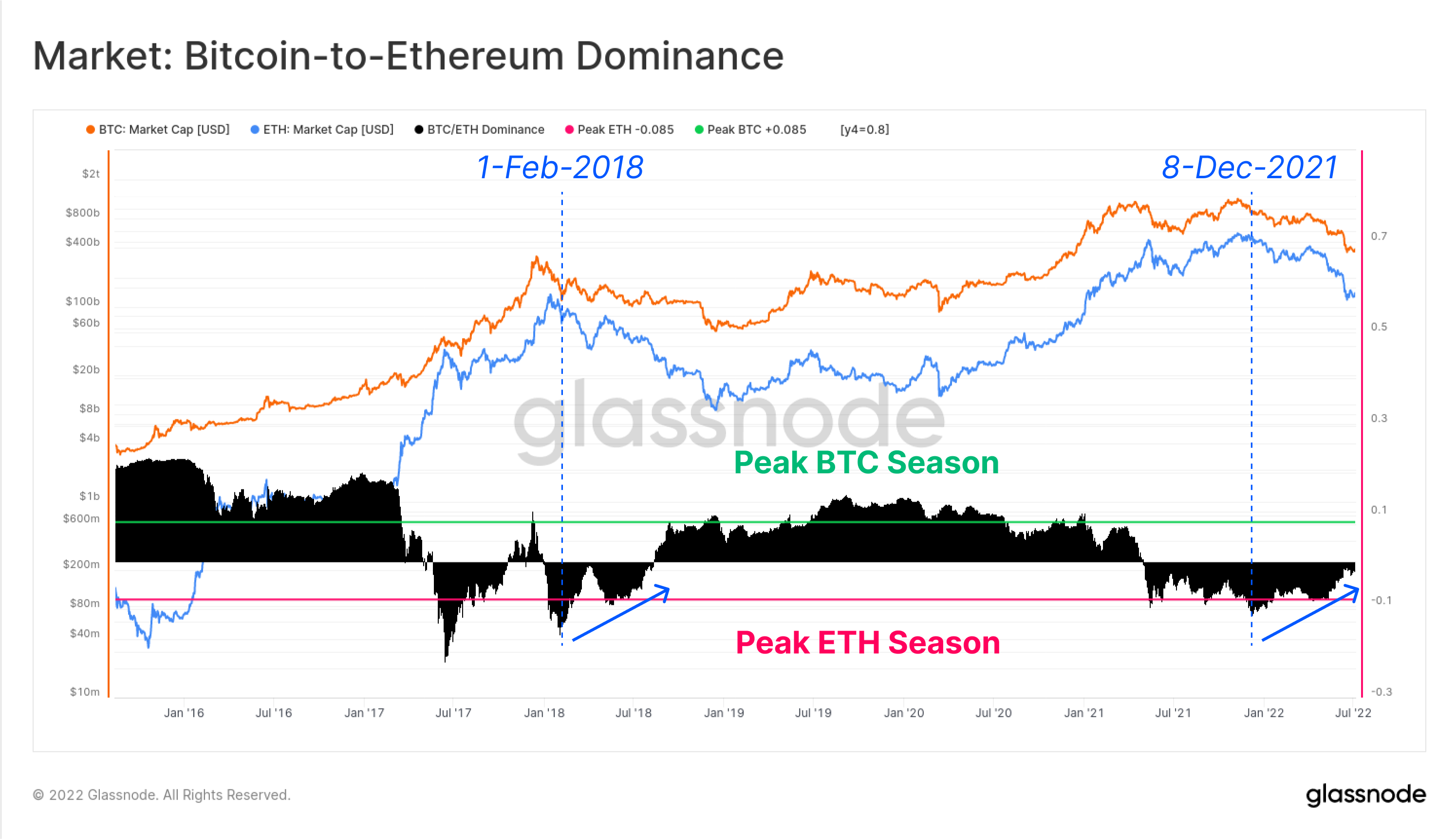 The chart below shows the relative dominance between Bitcoin and Ethereum Market Caps, and since early December 2021, capital has been rotating in favour of BTC. This trend is also similar in structure to the early 2018 bear market and was followed by almost three years of relative Bitcoin strength.