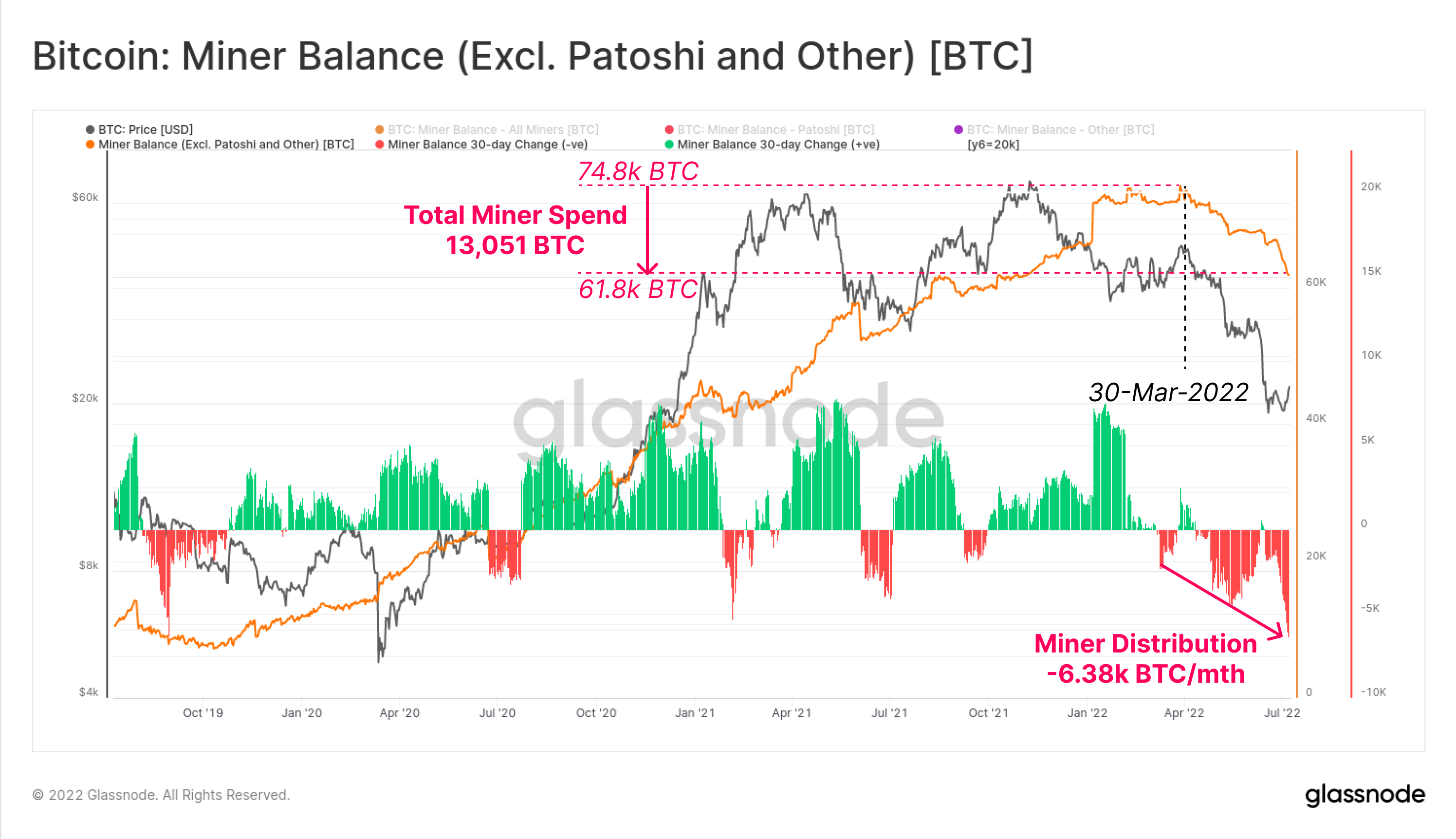 The pressure of low coin prices is greatly affecting the production side, with both Bitcoin and Ethereum miners seeing their operational costs rise, whilst incomes fall significantly. Bitcoin miners still hold some 61.8k BTC on their balance sheets, which remains at risk of (at least partial) distribution to cover their fixed costs. Ethereum miners are also soon to see Proof-of-Work deprecated, as the Merge ports Ethereum over to a Proof-of-Stake consensus mechanism.