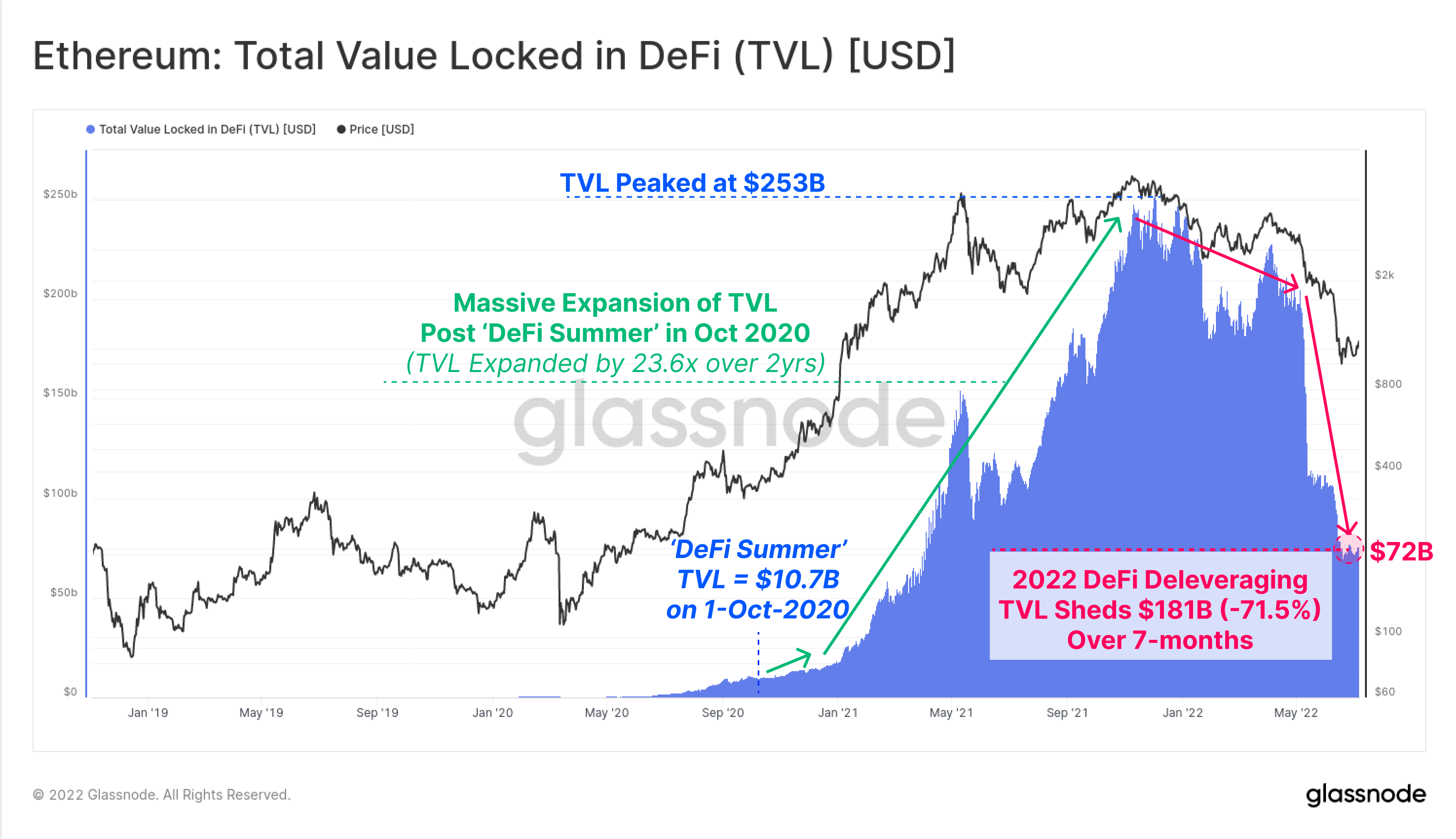 Since DeFi Summer, the Total Value Locked (TVL) in DeFi exploded higher, growing 23.6x over 2-years, expanding from just $10.7B, to over $253B. However, over the last 7-months, a great majority of this TVL has de-leveraged and unwound, falling by a remarkable 71.5%, and shedding $181B in value.