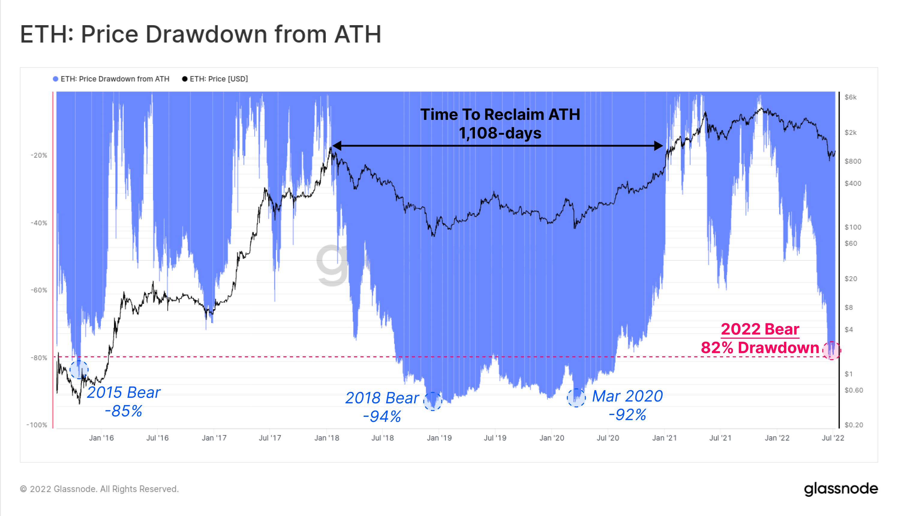 The 2018-2020 bear is the closest analogue, and bottomed at a drawdown between 92% and 94%, and took 1,108-days for ETH prices to reclaim the $1,416 ATH. In the 2022 bear market, thus far, ETH has seen an 82% decline below the $4.8k ATH set in Nov-2021.
