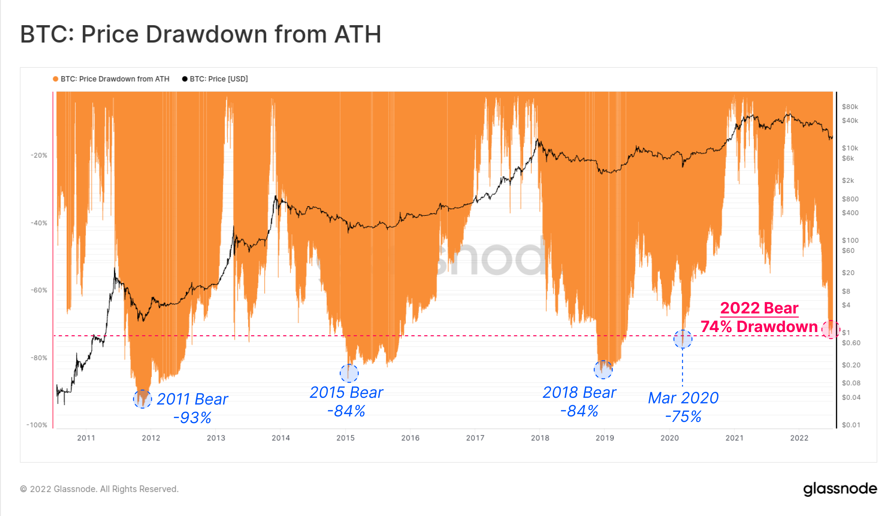 So far, the 2022 bear remains the least severe in history from a drawdown perspective, although the scale and magnitude of impact is arguably the largest to date. Over time, Bitcoin bear markets have bottomed at marginally less severe drawdowns each cycle, ranging from -93% in 2011, to -84% in 2015 and 2018, and -75% in March 2020.