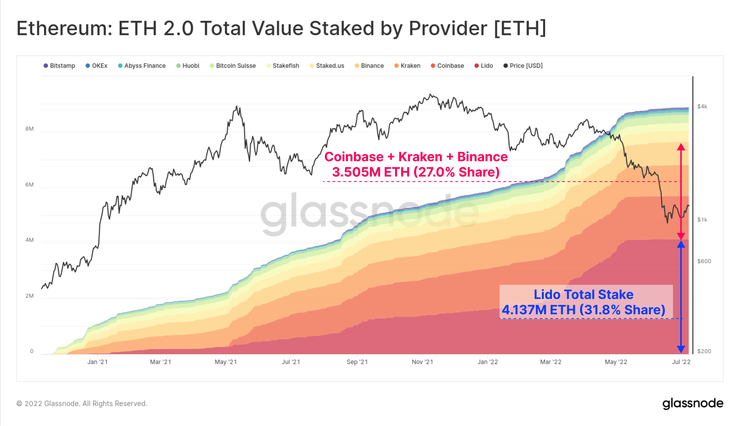 As a result, the total ETH staked via Lido has swelled to 4.137M ETH, accounting for an incredible 31.8% of the total 13.0M staked ETH. By comparison, the combined deposits of Coinbase, Kraken and Binance represent 3.505M ETH, which is 27.0% of the total.