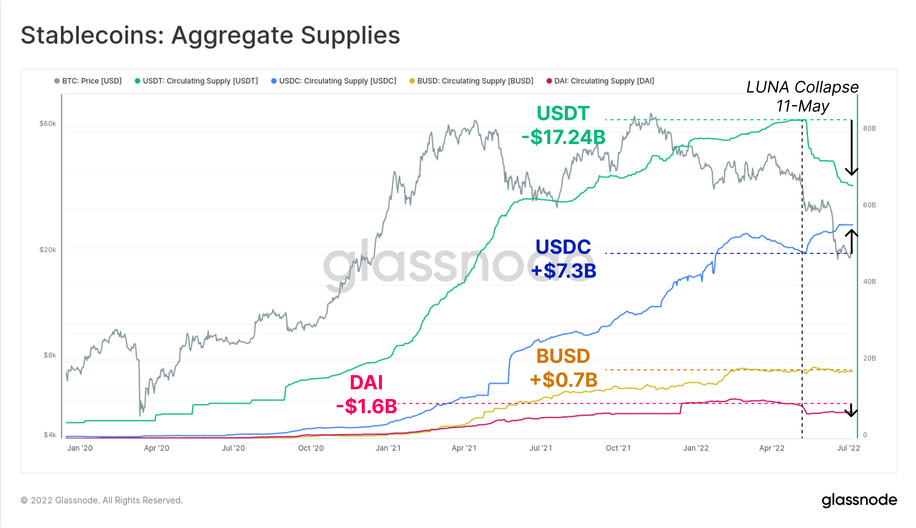 - Tether (USDT) in particular has seen its circulating supply decline by an incredible -$17.24 Billion (20% off $83B ATH) since 11-May, as large scale redemptions take place.
