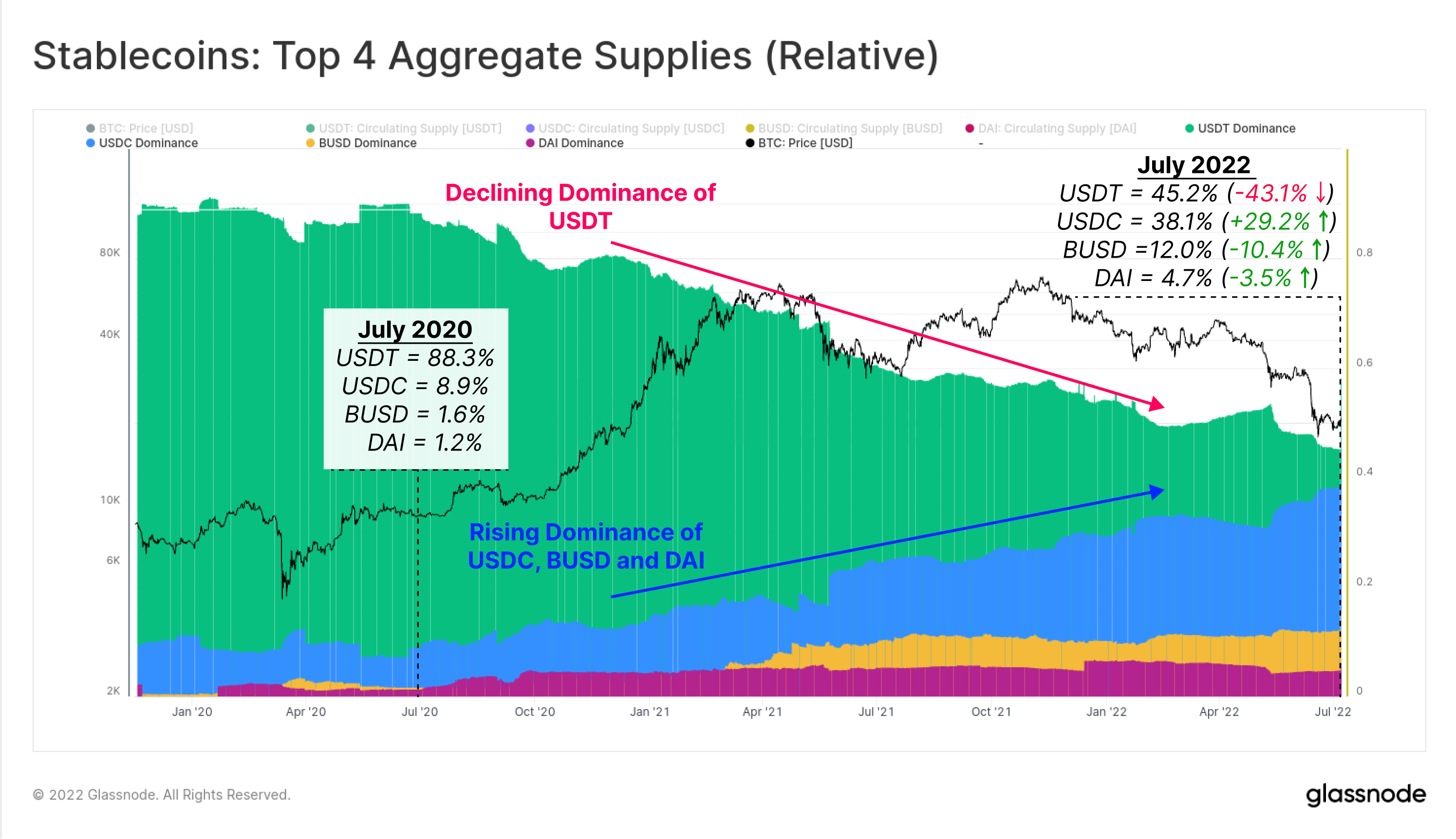 The 2022 bear market has been challenging for all digital asset investors, and has been the source of many structural shifts within the market. The market dominance of USDT has been in decline over the last two years, with a strong shift towards diversity with USDC, and BUSD dominance growing, particularly after the collapse of the LUNA-UST project.