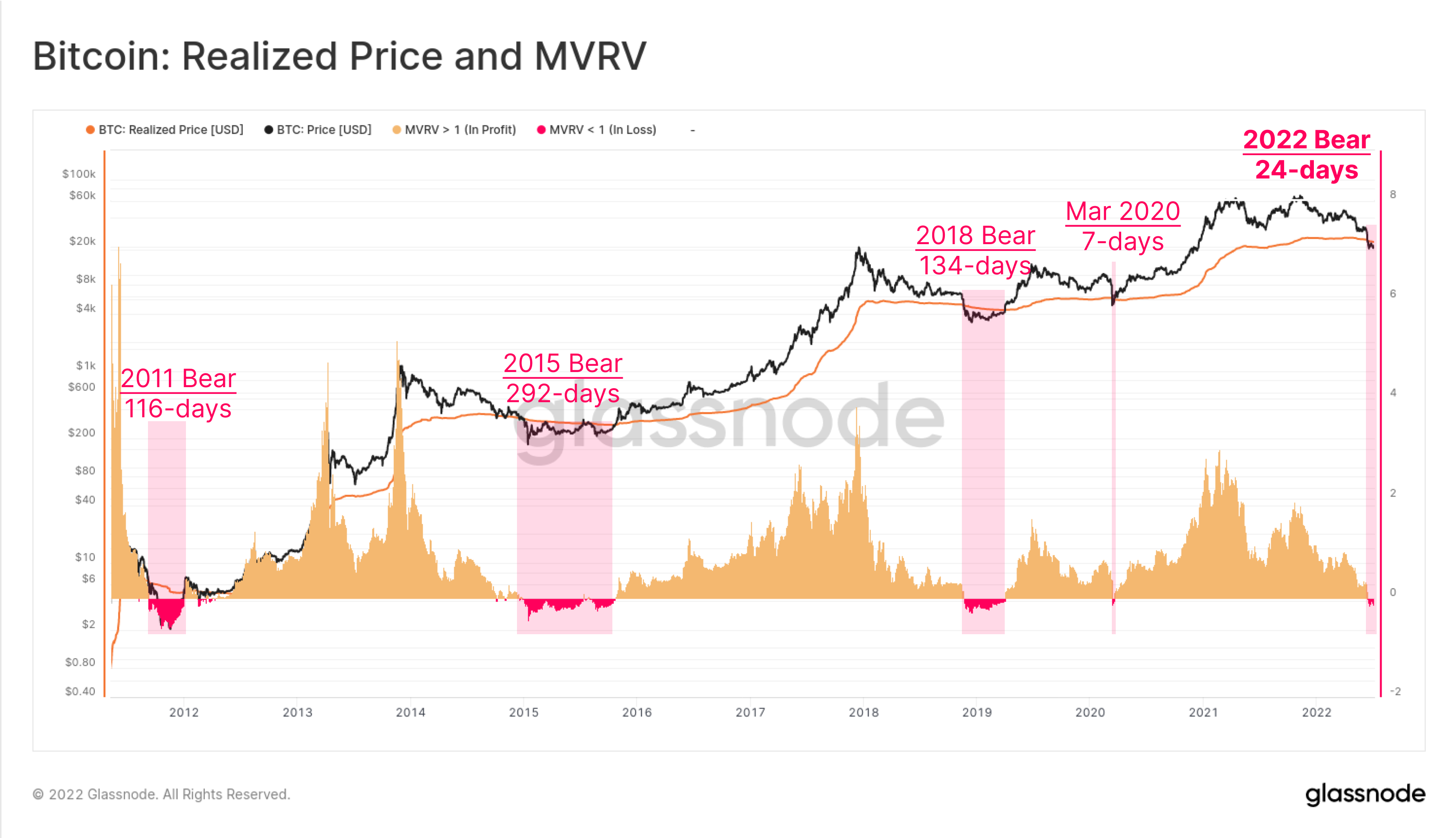 All historical Bitcoin bears have seen prices dip below the Realized Price for an average period of 180-days (excl. March 2020 which lasted just 7-days). When spot prices trade below the realized price, the MVRV Ratio will trade below a value of 1. This signals that the average Bitcoin investor is holding coins below their on-chain cost basis, and is thus is carrying an unrealized loss.