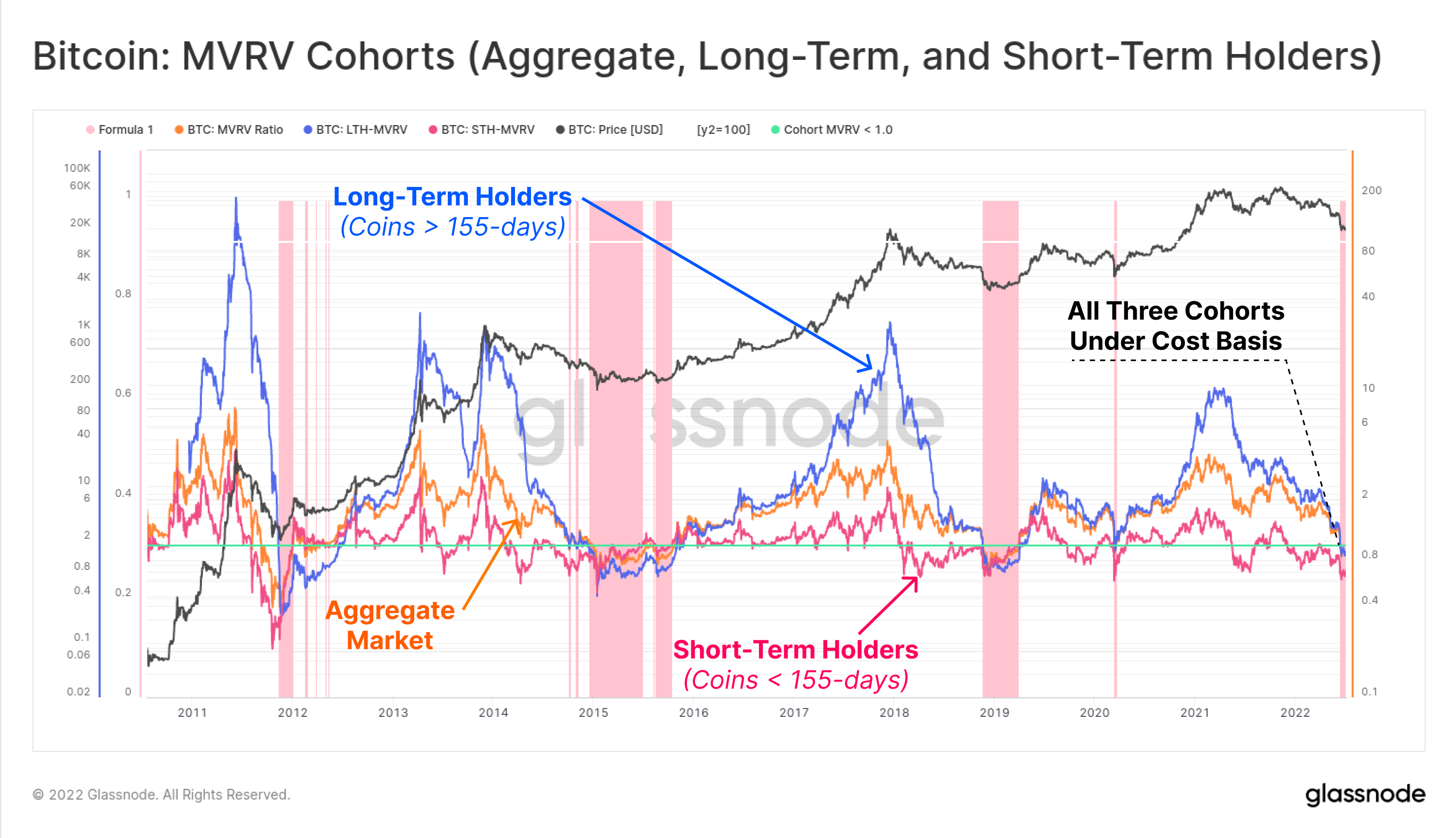- Short-Term Holders (pink) who have held coins less than 155-days, and are statistically most likely to react, and spend coins in the face of market volatility.
