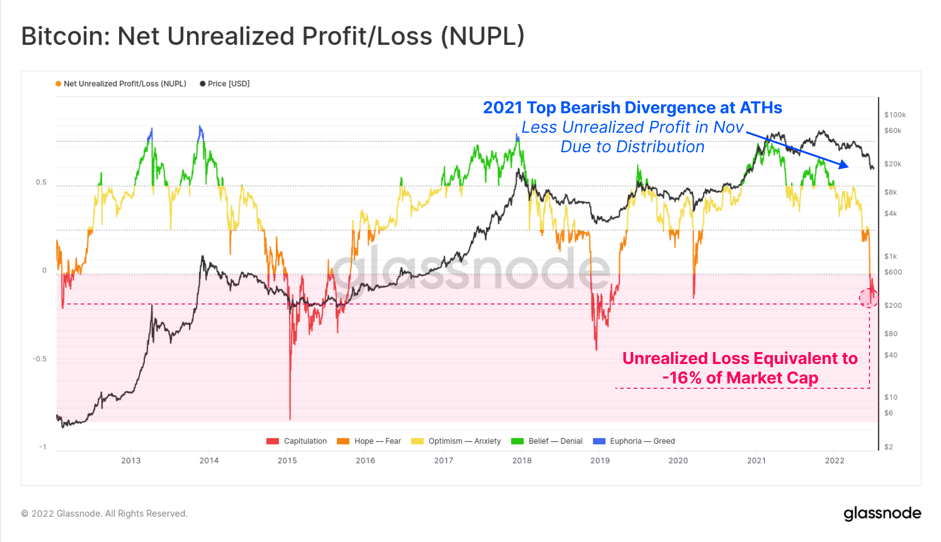 - A macro bearish divergence can be seen to develop between the April, and November market peaks (shown in blue). This is a result of investors spending their coins during the Aug-Nov 2021 rally, making for a higher aggregate cost basis, and thus a smaller unrealized profit held in the system (i.e. many investors took profits on the way up).