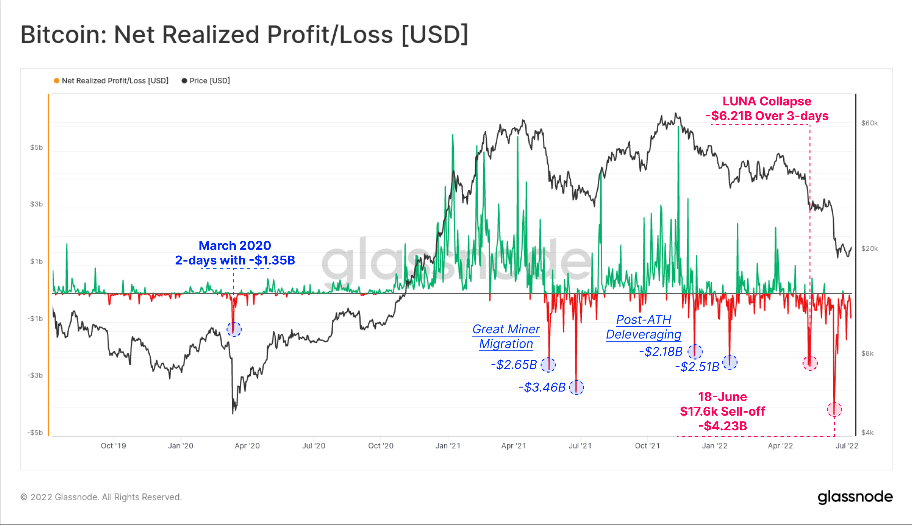 - May-June 2022 saw credit contagion take hold in the market. As the LUNA-UST project collapsed in mid-May, Bitcoin investors realized net losses in excess of -$6.21B over a three day period. The second event occurred on 18-June as Bitcoin prices fell to $17.6k, and set the current record one-day net realized loss of $4.23B. This occurred as BTC prices broke below the previous cycle ATH for the first time in history.