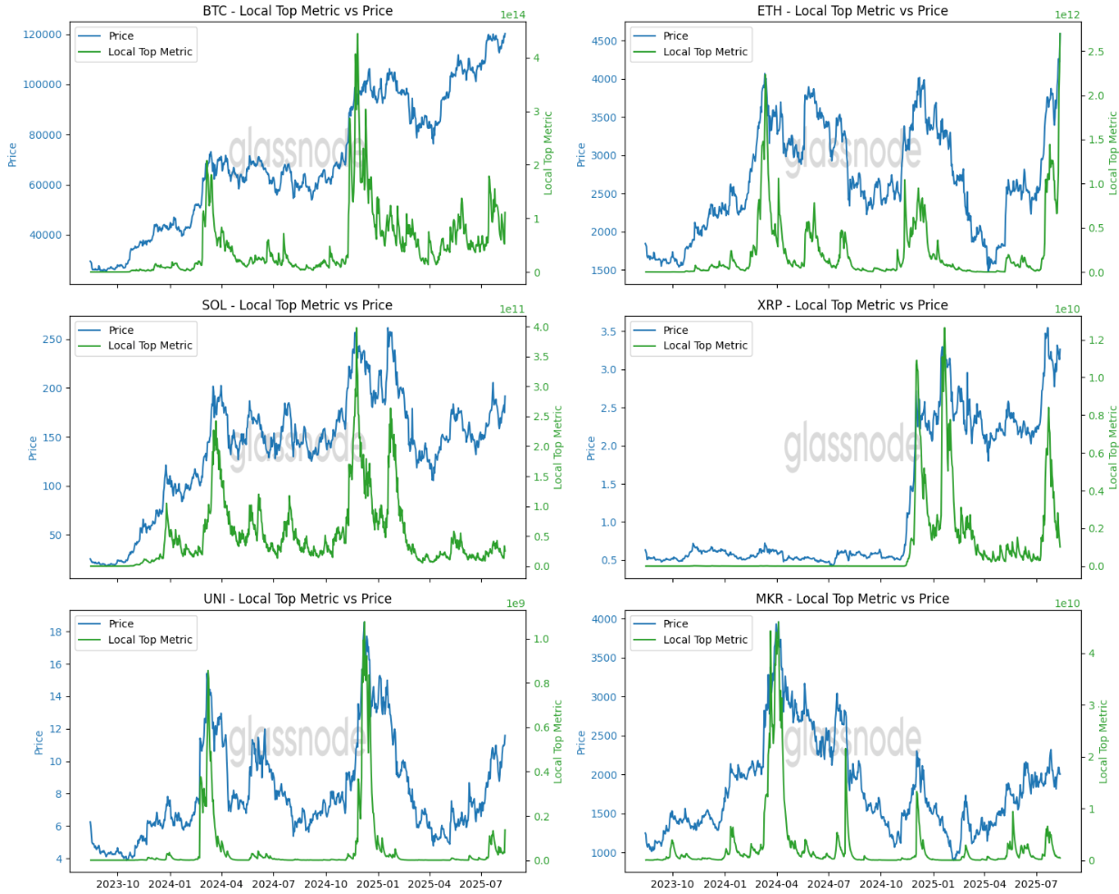 Green line – Local Top Metric: Measures profit-weighted selling pressure, with spikes indicating periods of widespread profit-taking and market euphoria, often aligning with local market tops.