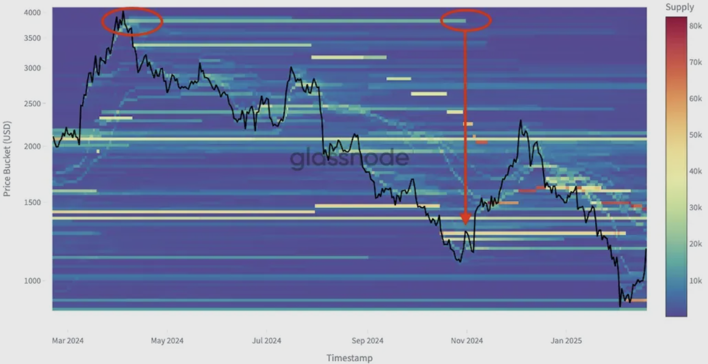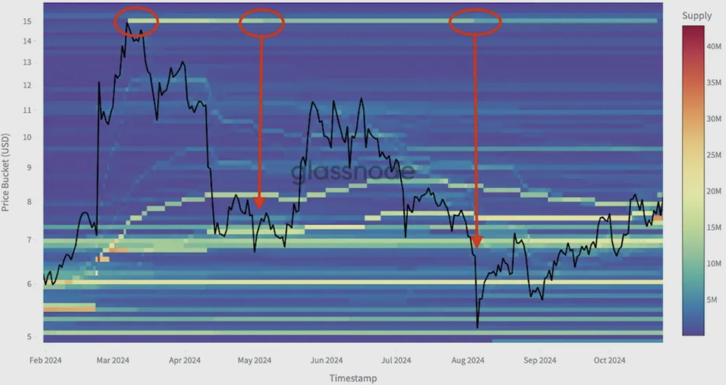 - Supply originally accumulated near the $15 peak gradually shifts from warmer to cooler colors over time.