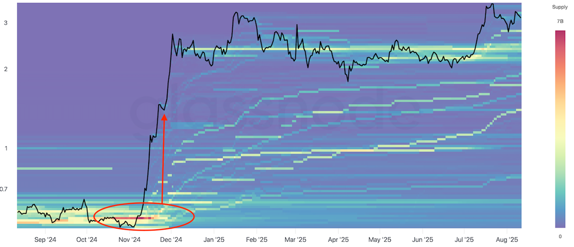 This reflects a cohort of investors accumulating positions at relatively low prices. - As price surged above $2.50, supply in this band rapidly thinned, with warm colors fading as holders realized profits into the rally.