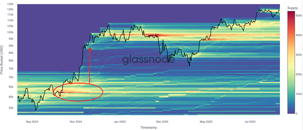 In the months preceding the late 2024 surge, Bitcoin’s CBD heatmap shows a substantial band of supply forming in the $60k–$65k range. This reflects significant accumulation from buyers entering during a consolidation phase.