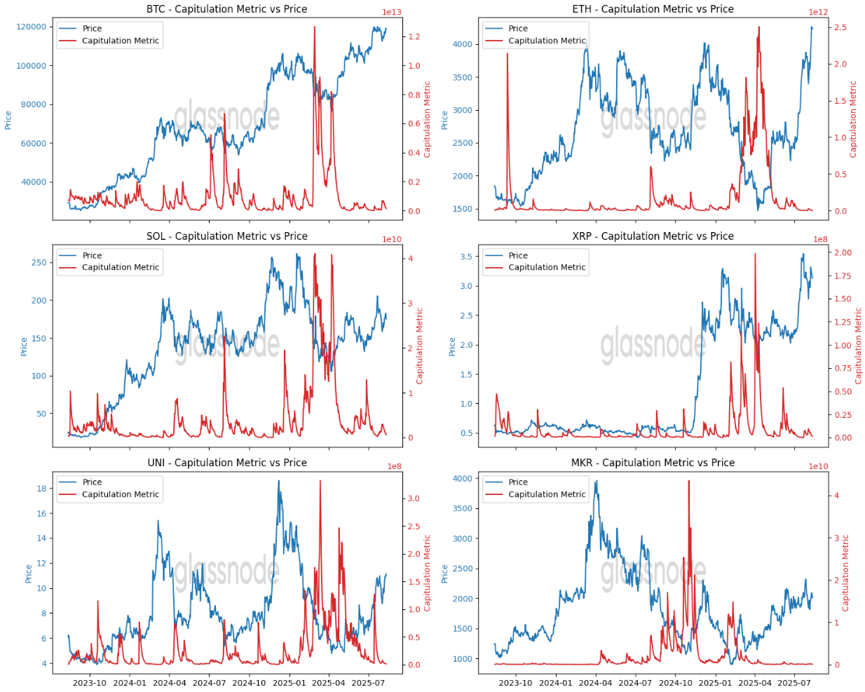 Red line – Capitulation Metric: Measures loss-weighted selling pressure, with spikes indicating periods of intense distress and forced selling, often coinciding with local market bottoms.