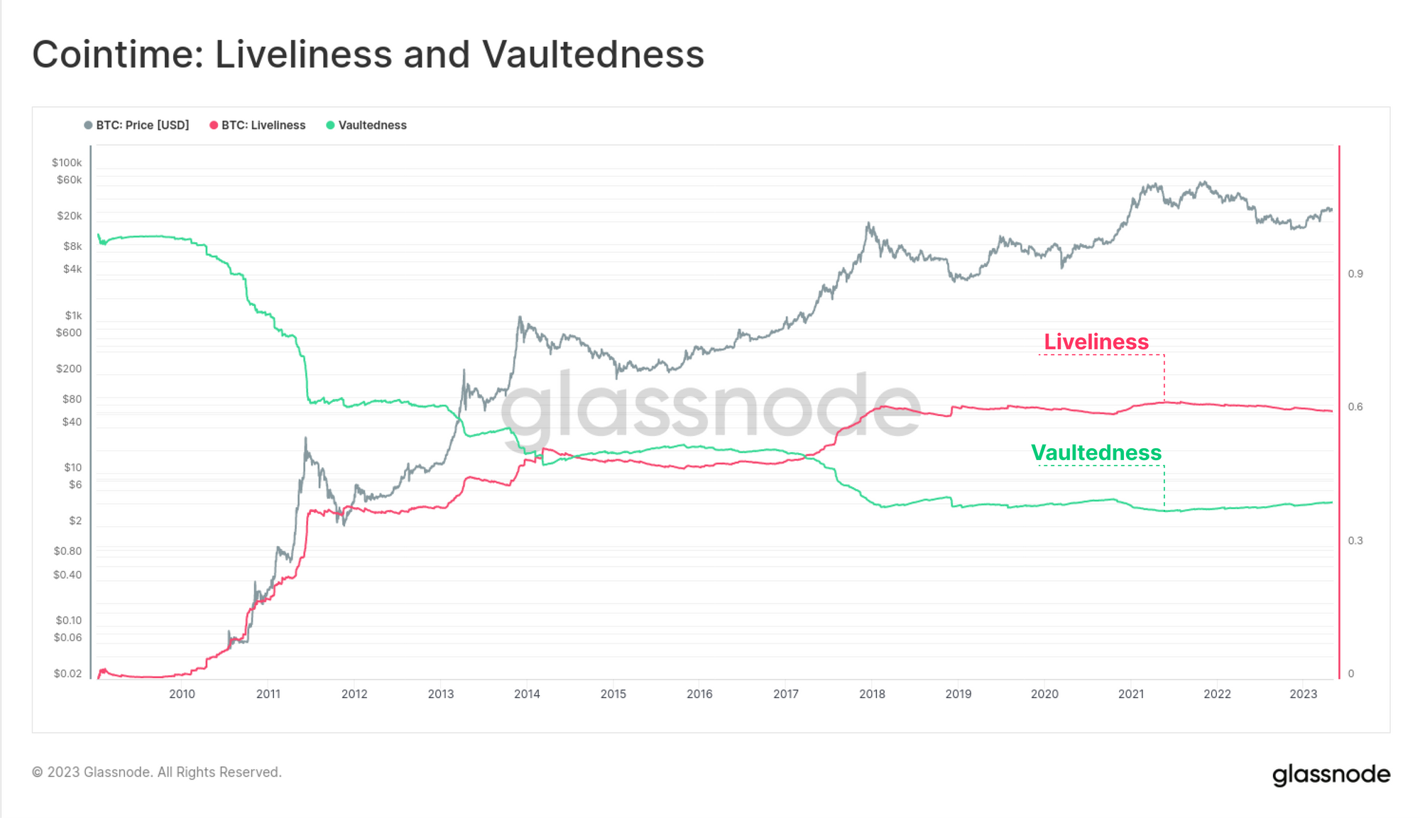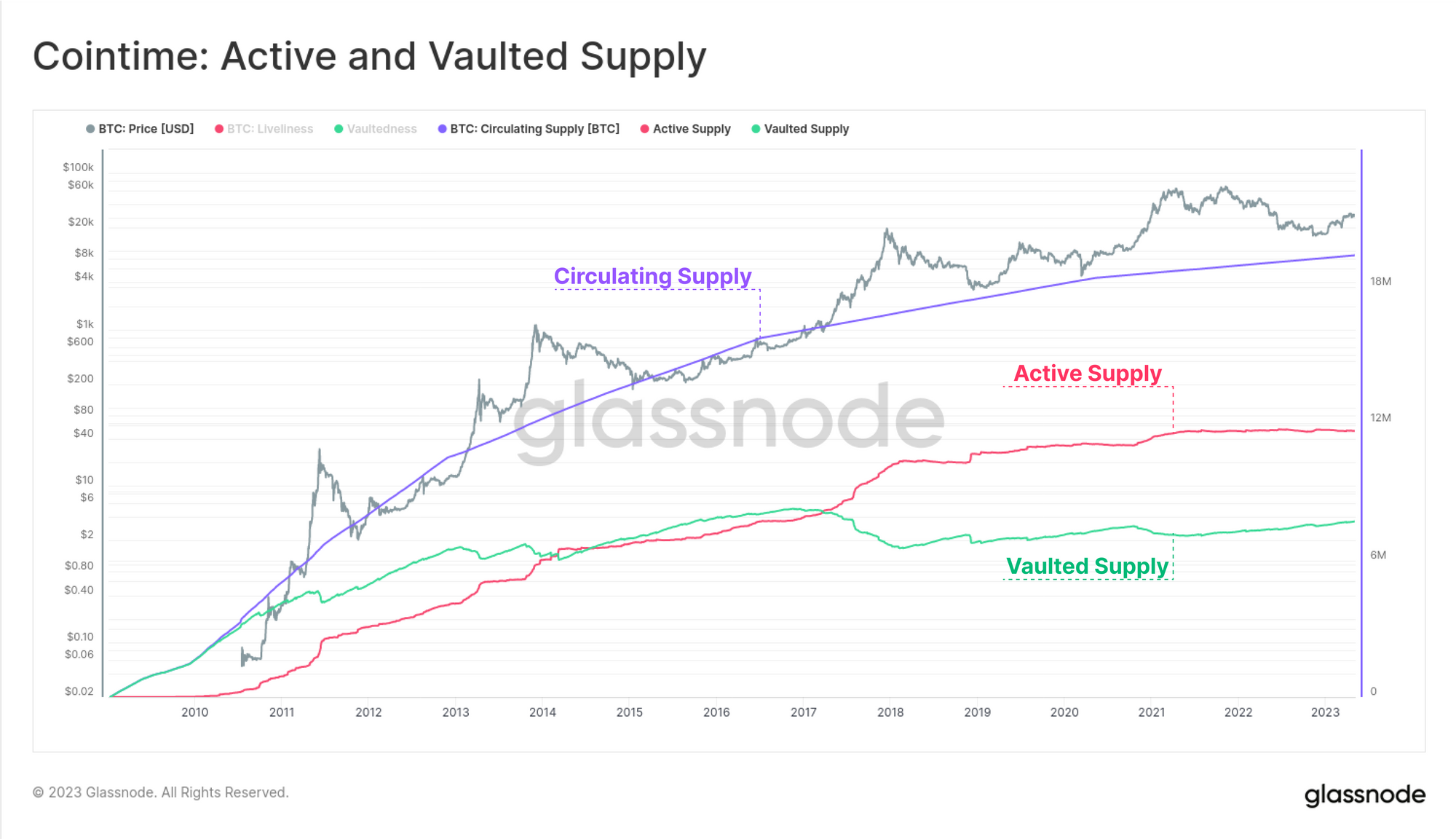 Cointime Economics introduces a simplified framework to efficiently discount the impact of lost supply, and amplify economic impacts on the truly active supply. Rather than applying proprietary heuristics and assumptions about the state of UTXOs, Cointime Economics uses simple and easy to measure inputs to bifucate the supply into Active, and Vaulted regions.