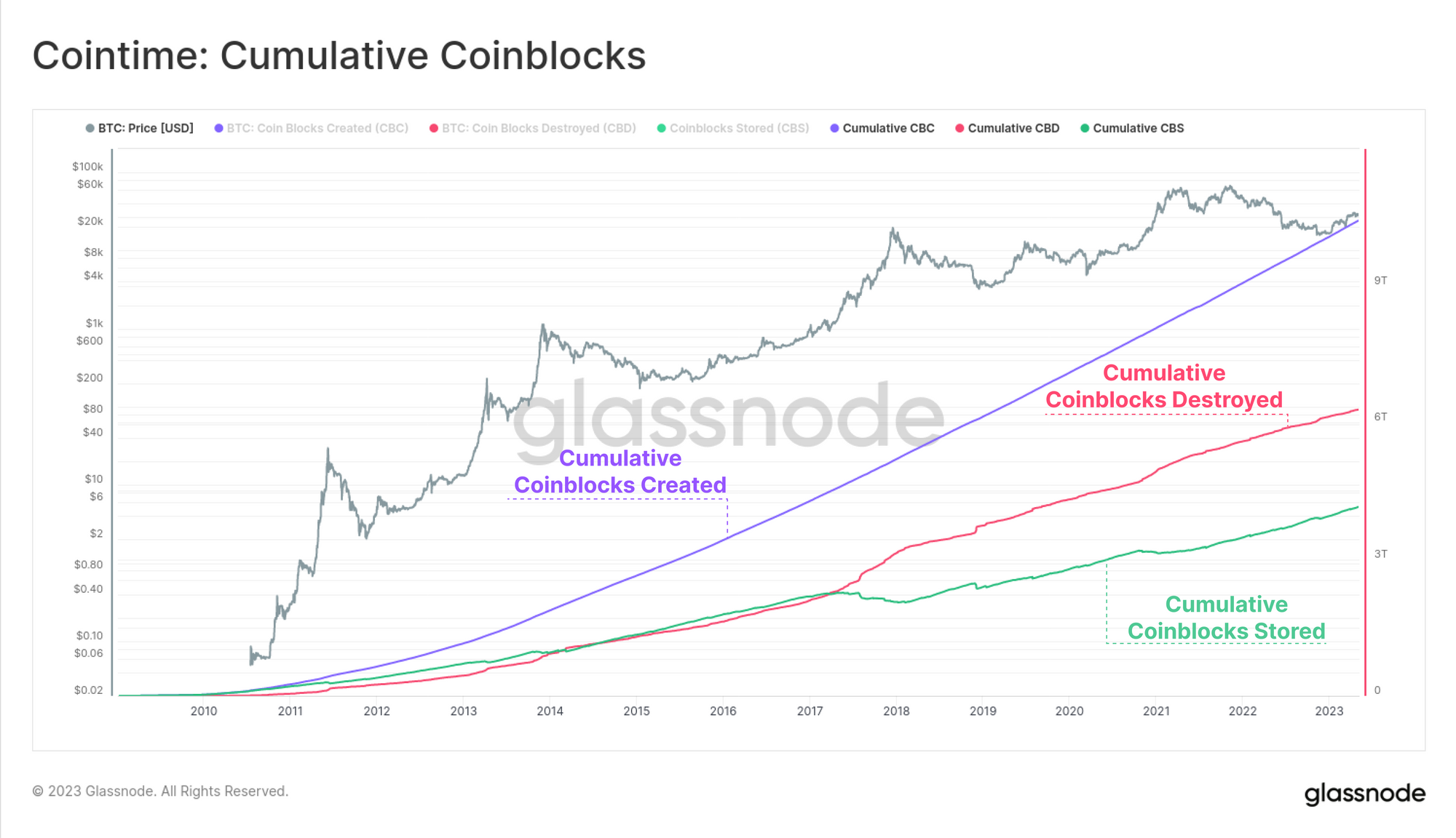 In Cointime Economics, coinblocks can transition between three states: Created, Destroyed, or Stored. Every new block added to the Bitcoin economy generates additional coinblocks, termed as Coinblocks Created (CBC). On the other hand, the act of spending accumulated coinblocks within UTXOs leads to their destruction, aptly named Coinblocks Destroyed (CBD). At a macro scale, the aggregate state of the network is defined by Liveliness and Vaultedness, describing the relative activity and inactivity of the supply, respectively.